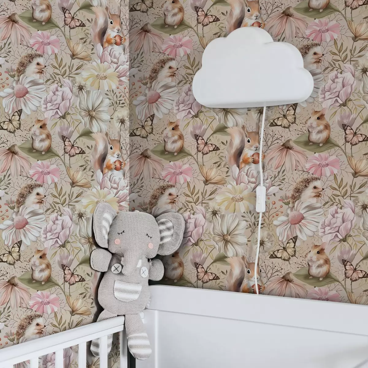 Behang Schattige egel, eekhoorn, hamster en vlinders met bloemen in pastelkleuren Nr. a00051