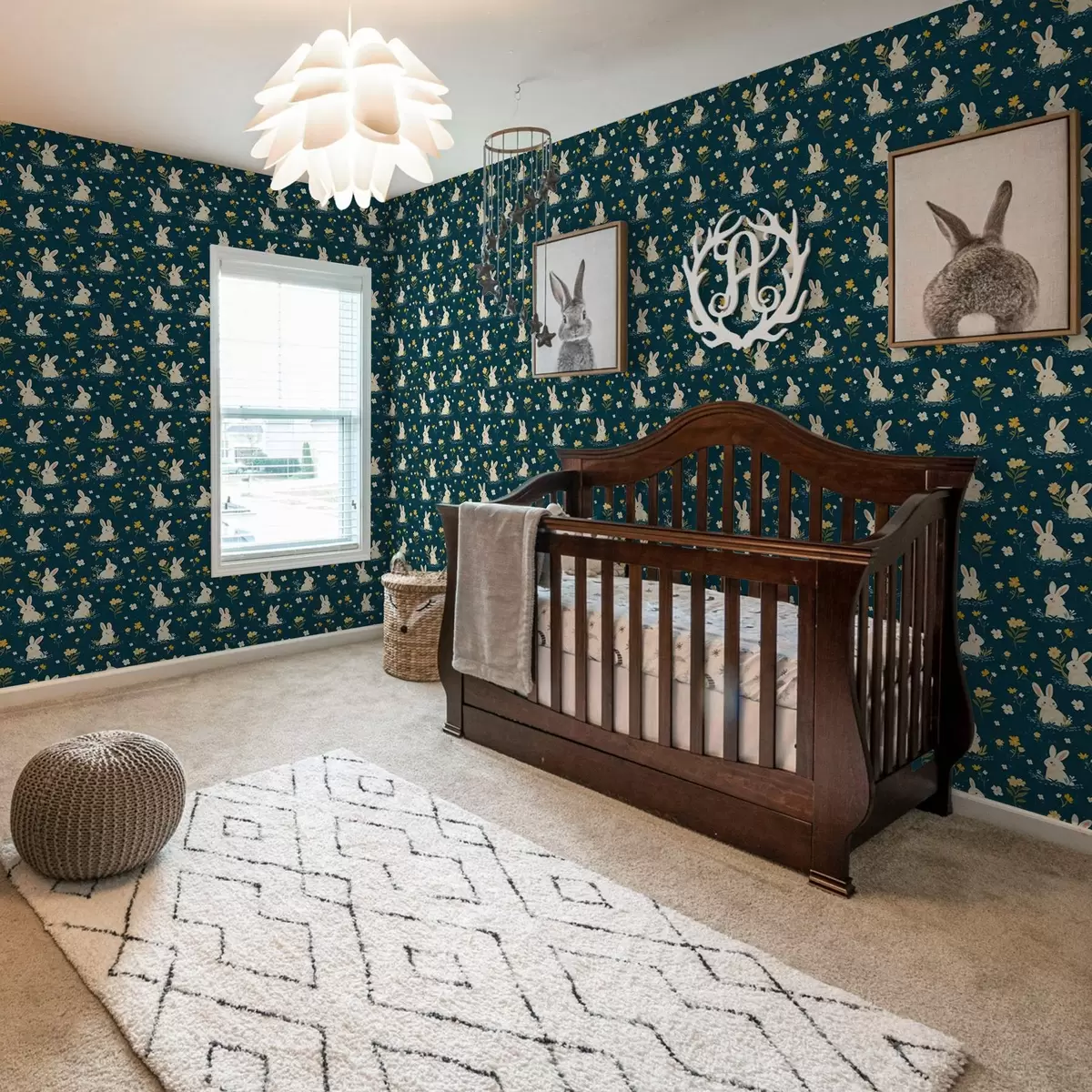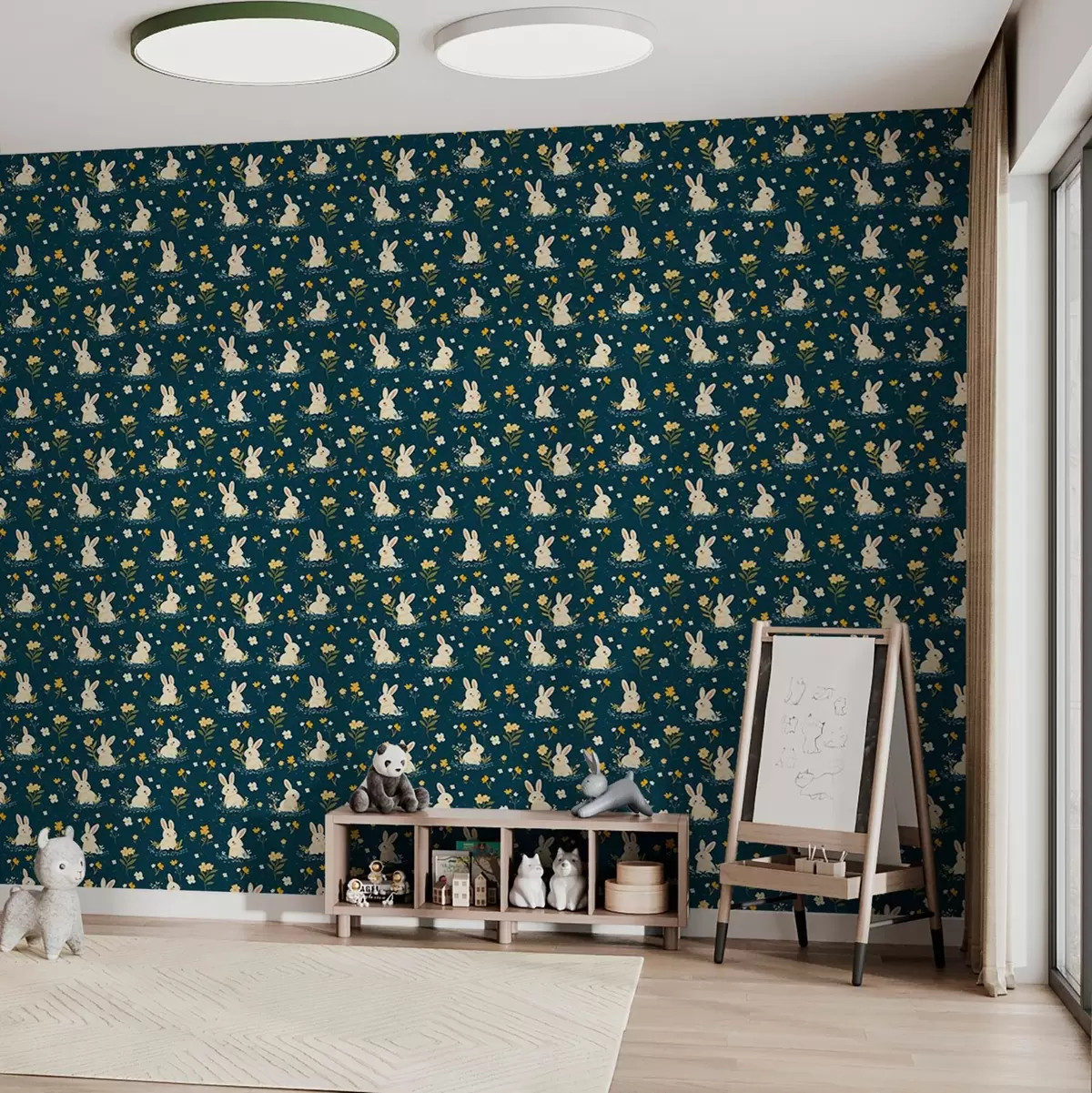 Behang Konijnen in gras en bloemen op donkere achtergrond Nr. a00080
