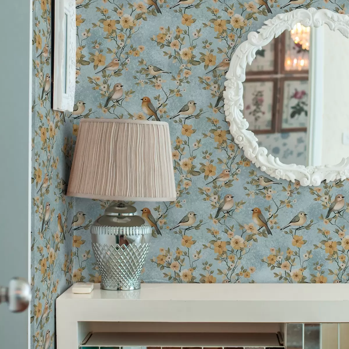 Behang Kleine vogels op takken op blauwe achtergrond Nr. a00092
