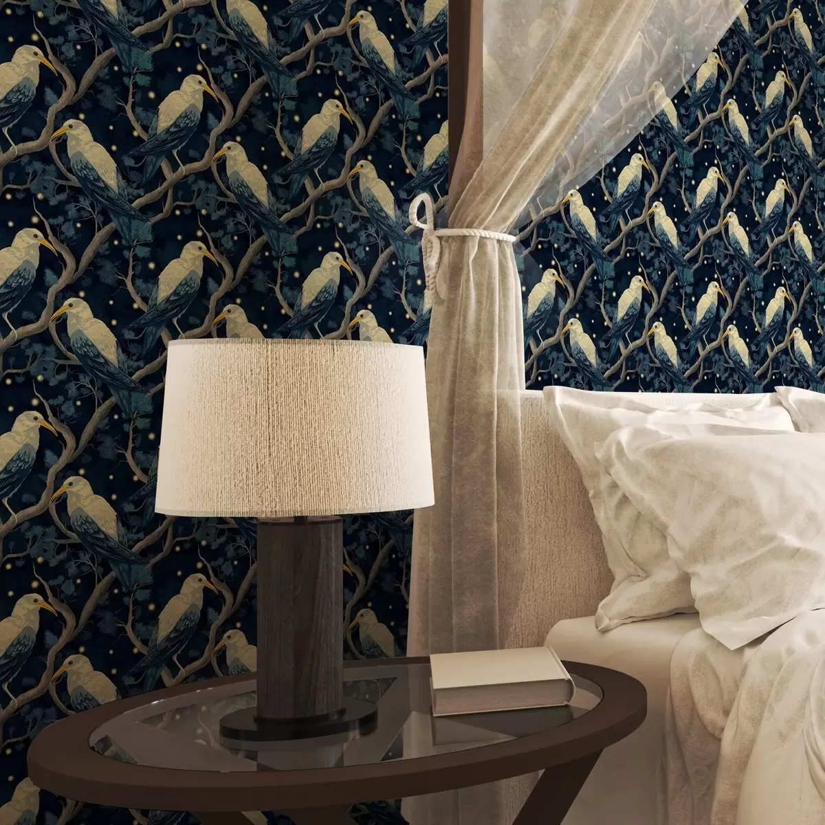 Behang Witte vogels op takken tussen glanzende vuurvliegjes in het nachtbos a00109