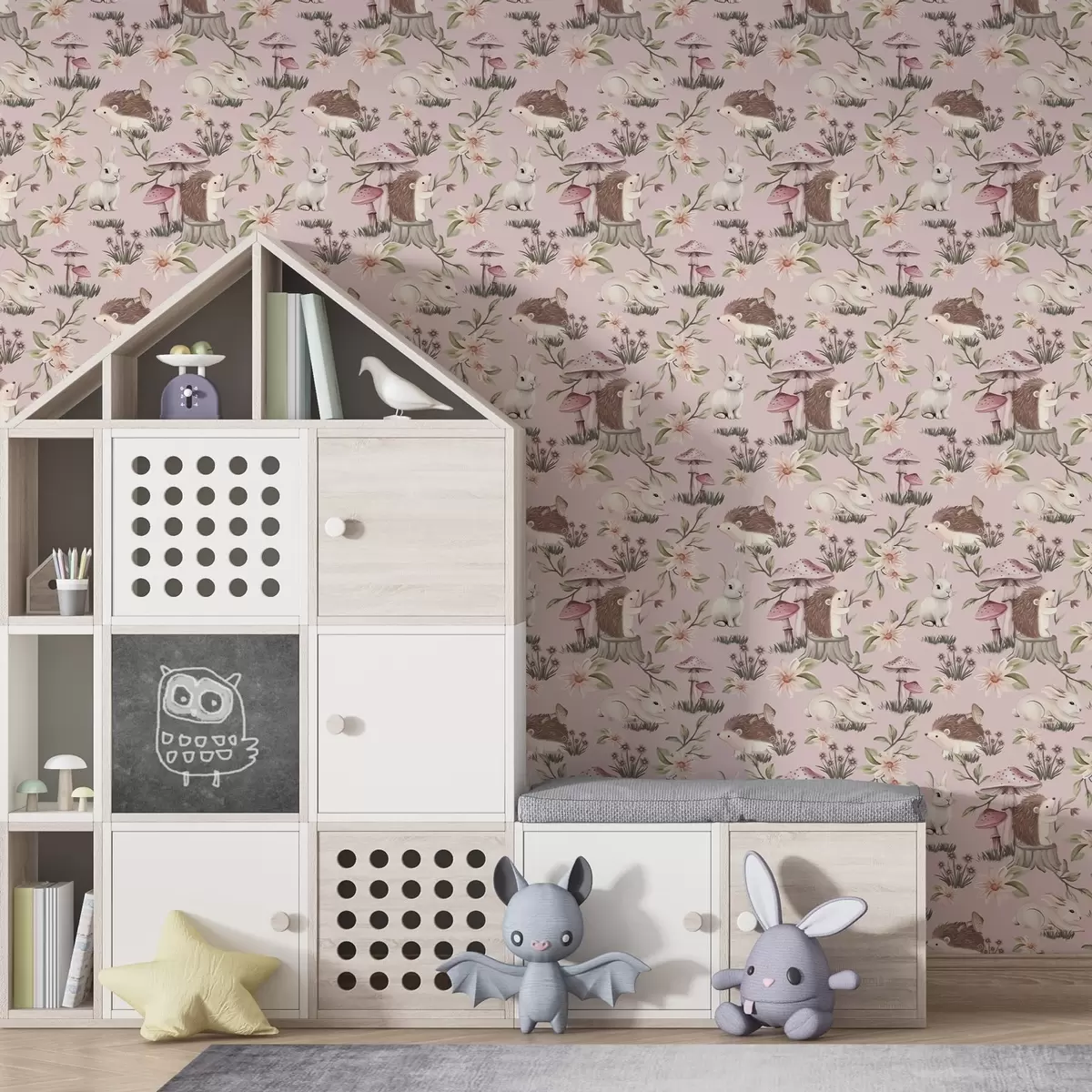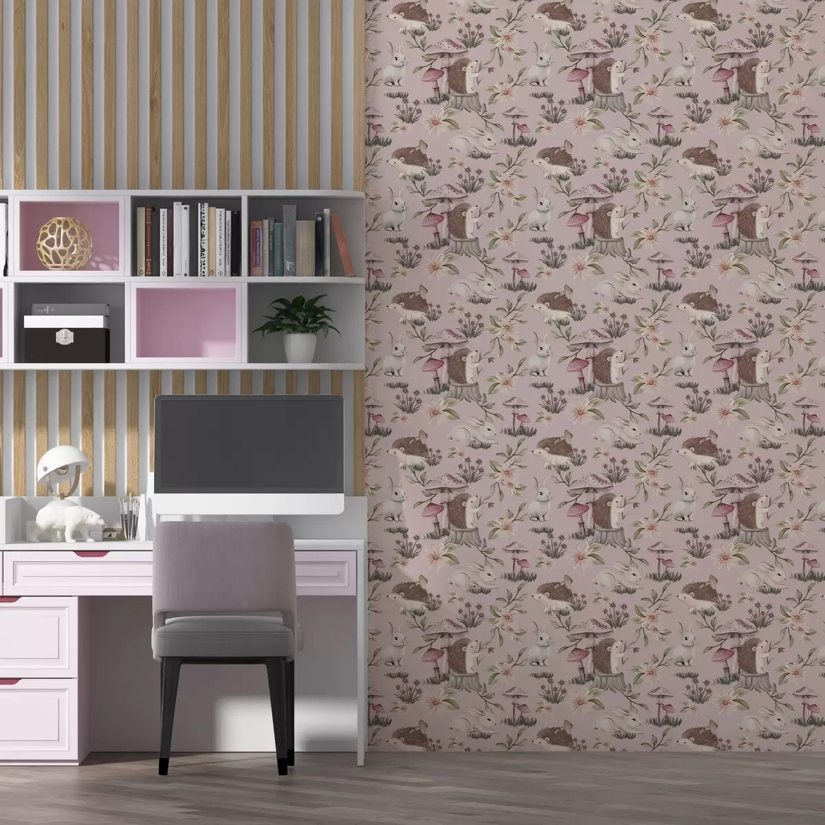 Behang Sprookjesachtige egels, konijnen en bloemen tussen paddenstoelen op roze achtergrond Nr. a00111