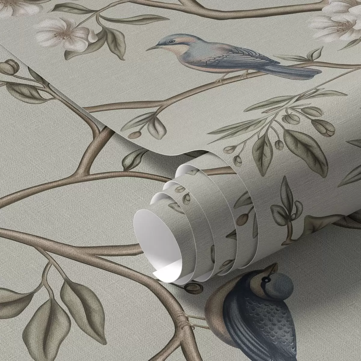 Behang Takken met vogels en witte bloemen op een delicate achtergrond Nr. a00303