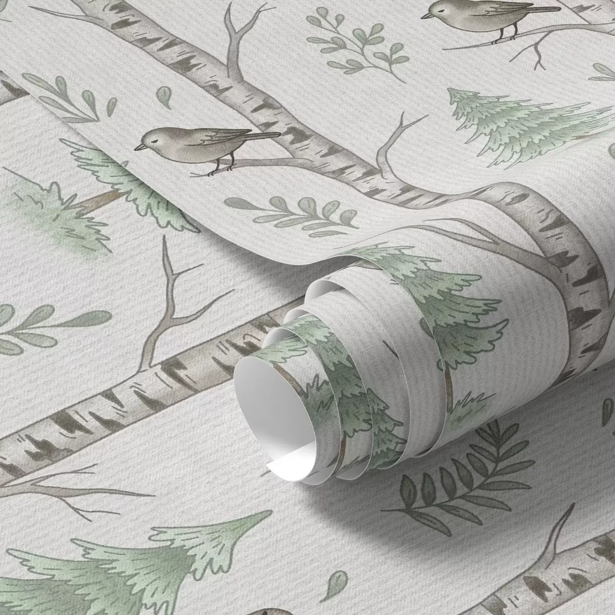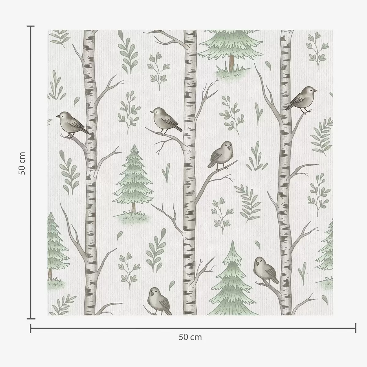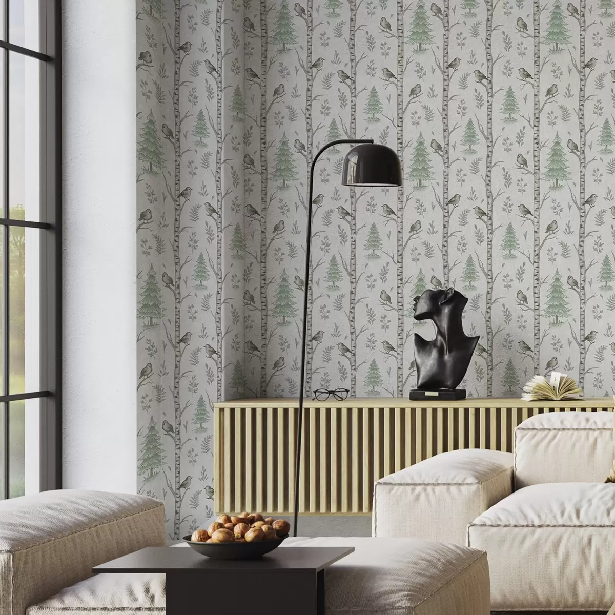 Behang Berken met vogels in een lichtgroen bos Nr. a00316