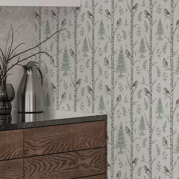 Behang Berken met vogels in een lichtgroen bos Nr. a00316