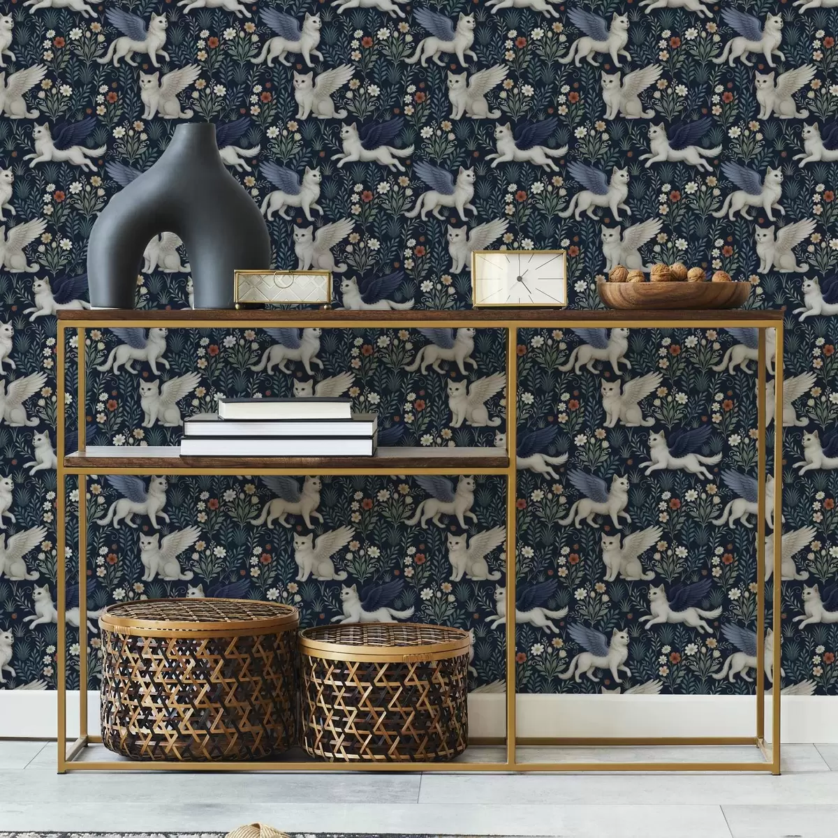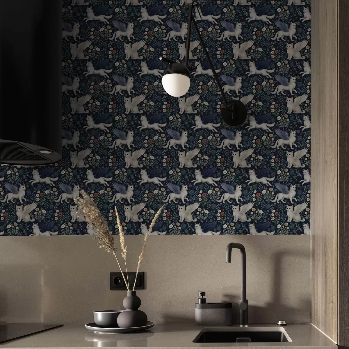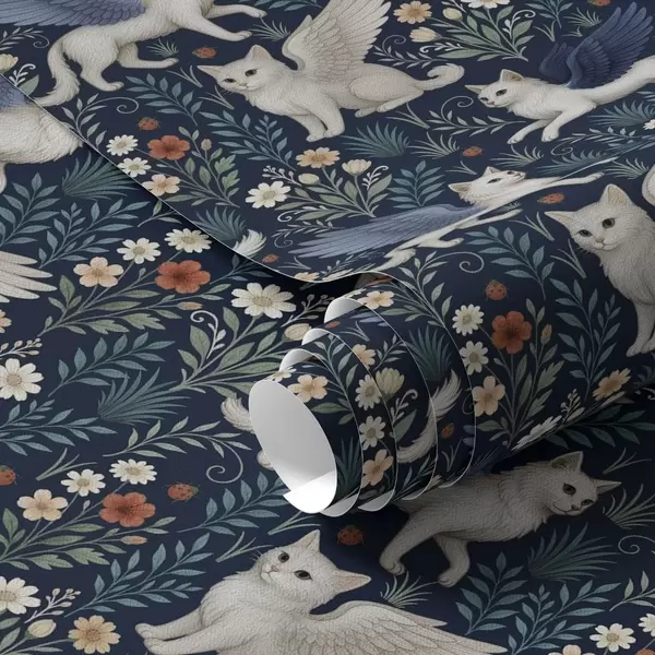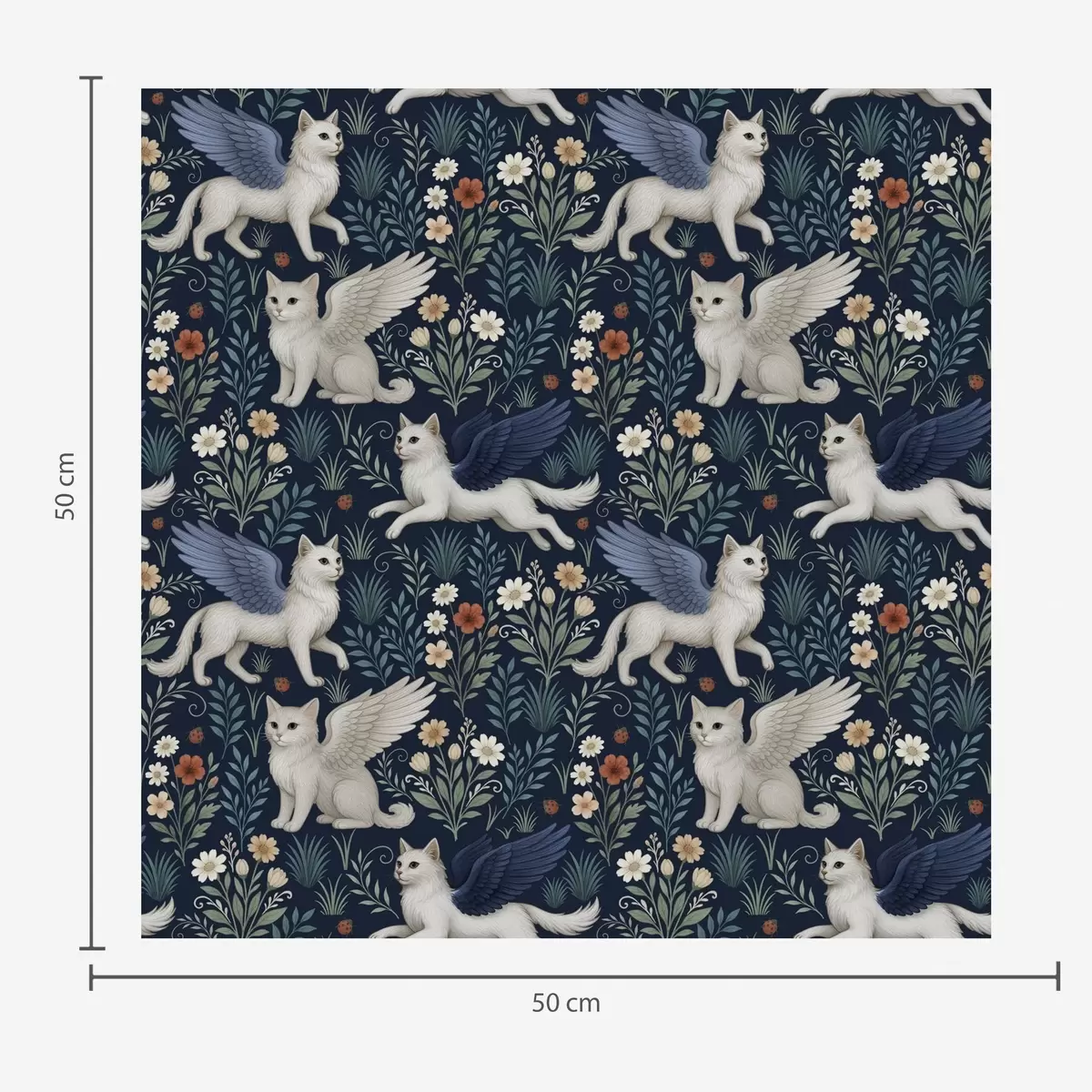 Behang Fantasie katten met vleugels tussen bloemen Nr. a00408