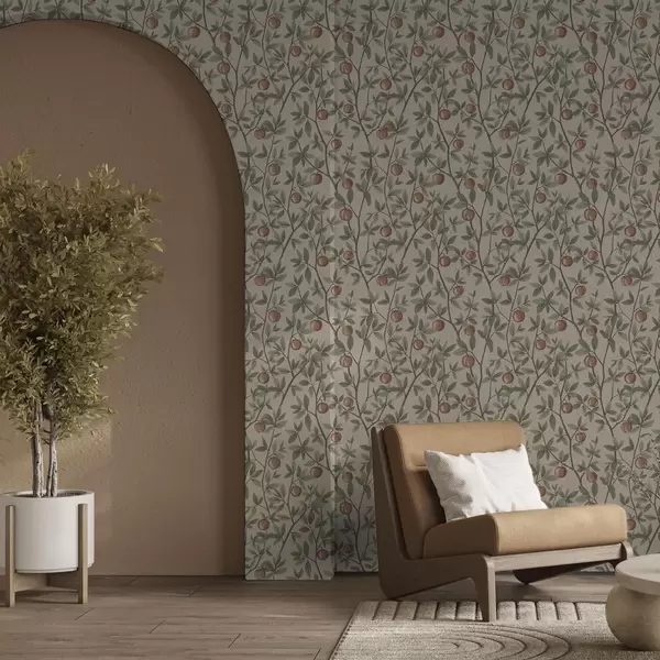 Behang Perziken op takken met groene bladeren op beige achtergrond Nr. a00429