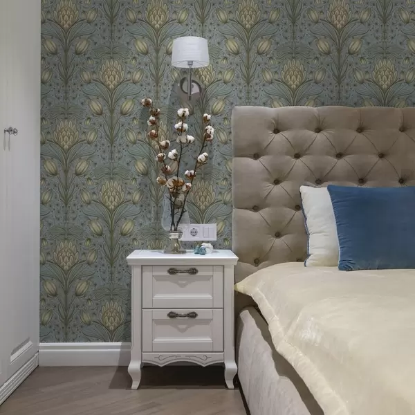 Behang Blauw patroon met artisjokken en tulpen Nr. a00435