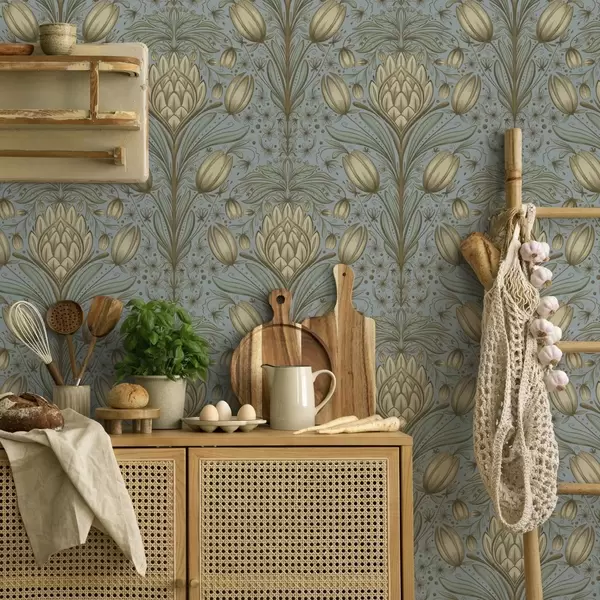 Behang Blauw patroon met artisjokken en tulpen Nr. a00435