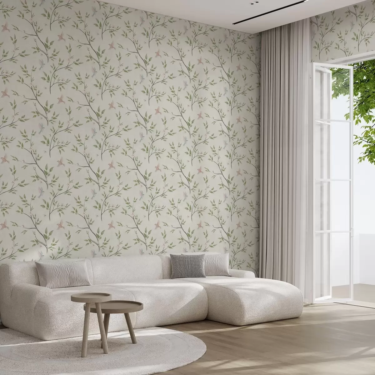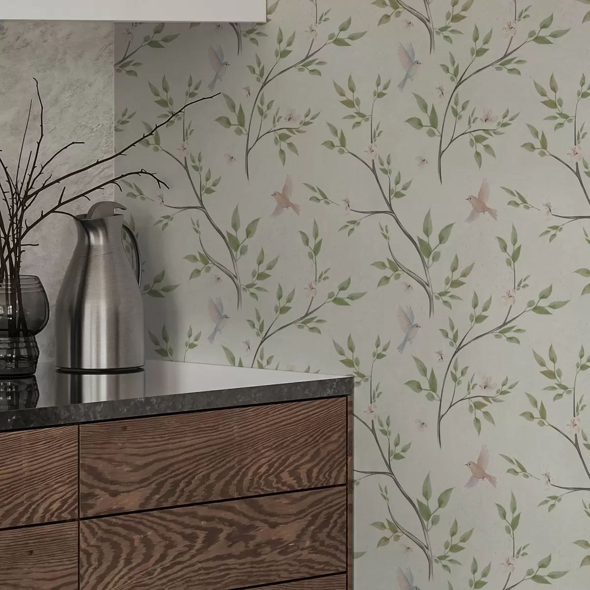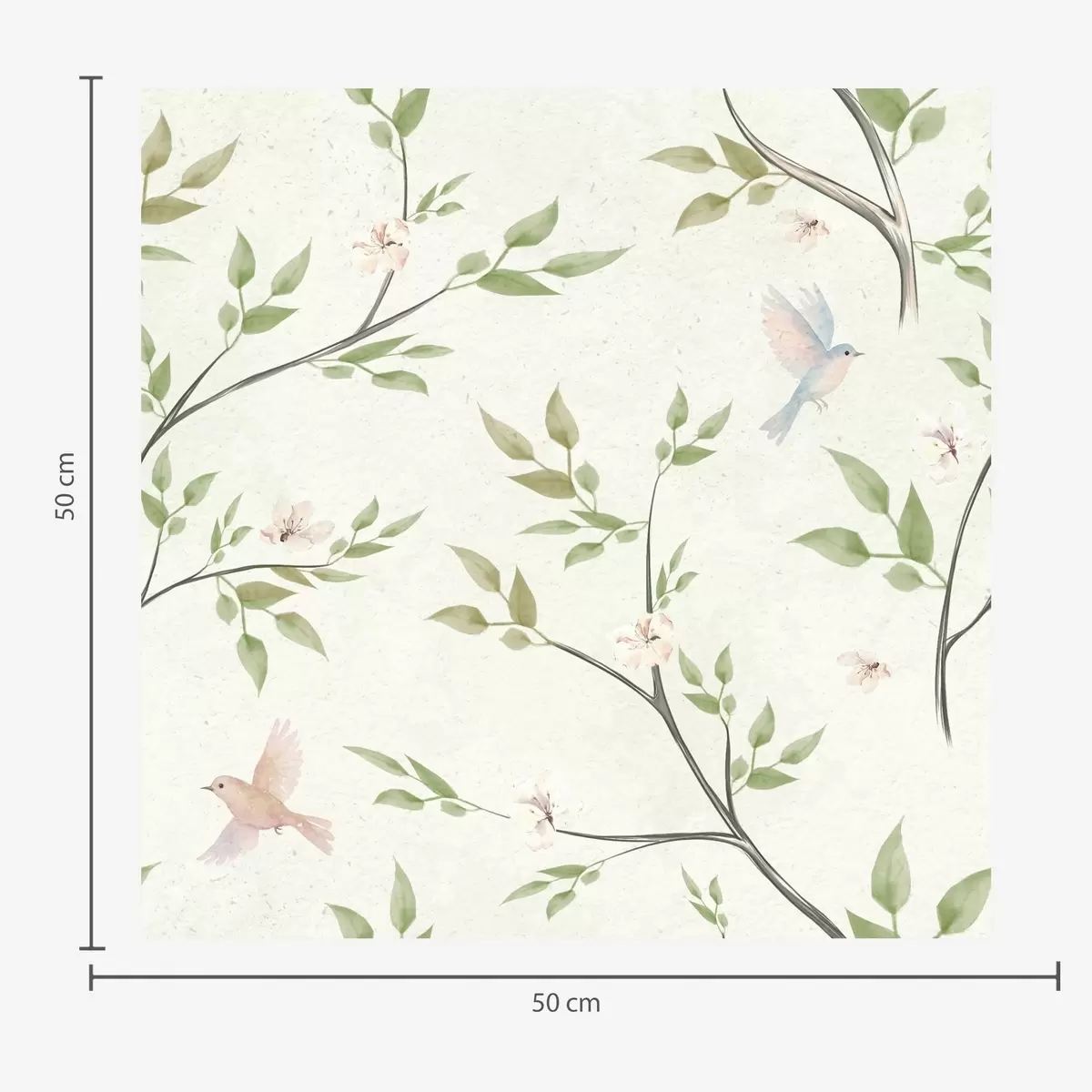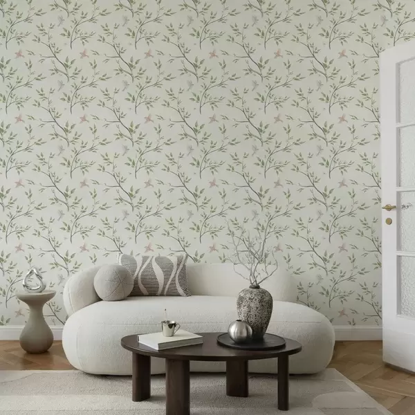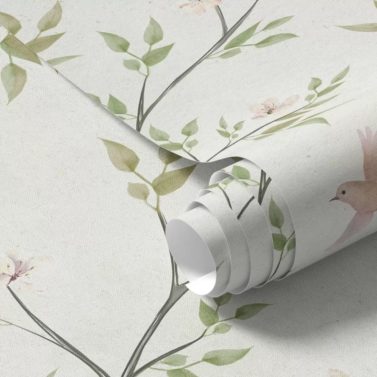Behang Aquarel takken met bladeren en vogels op een lichte achtergrond Nr. a00496