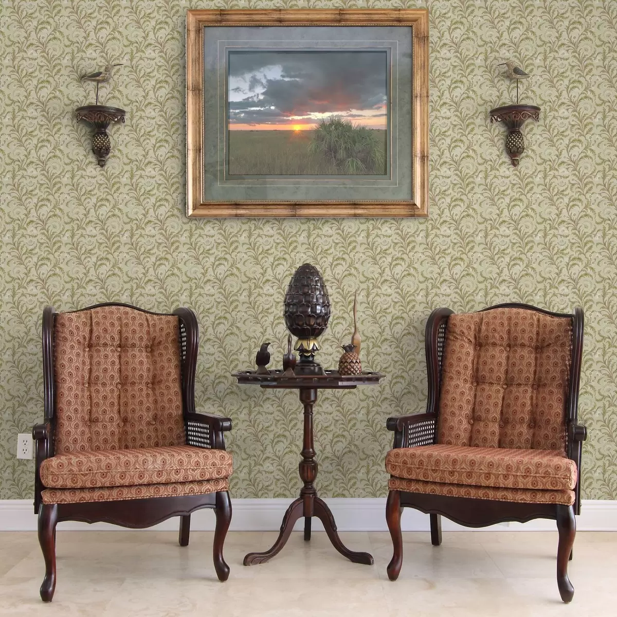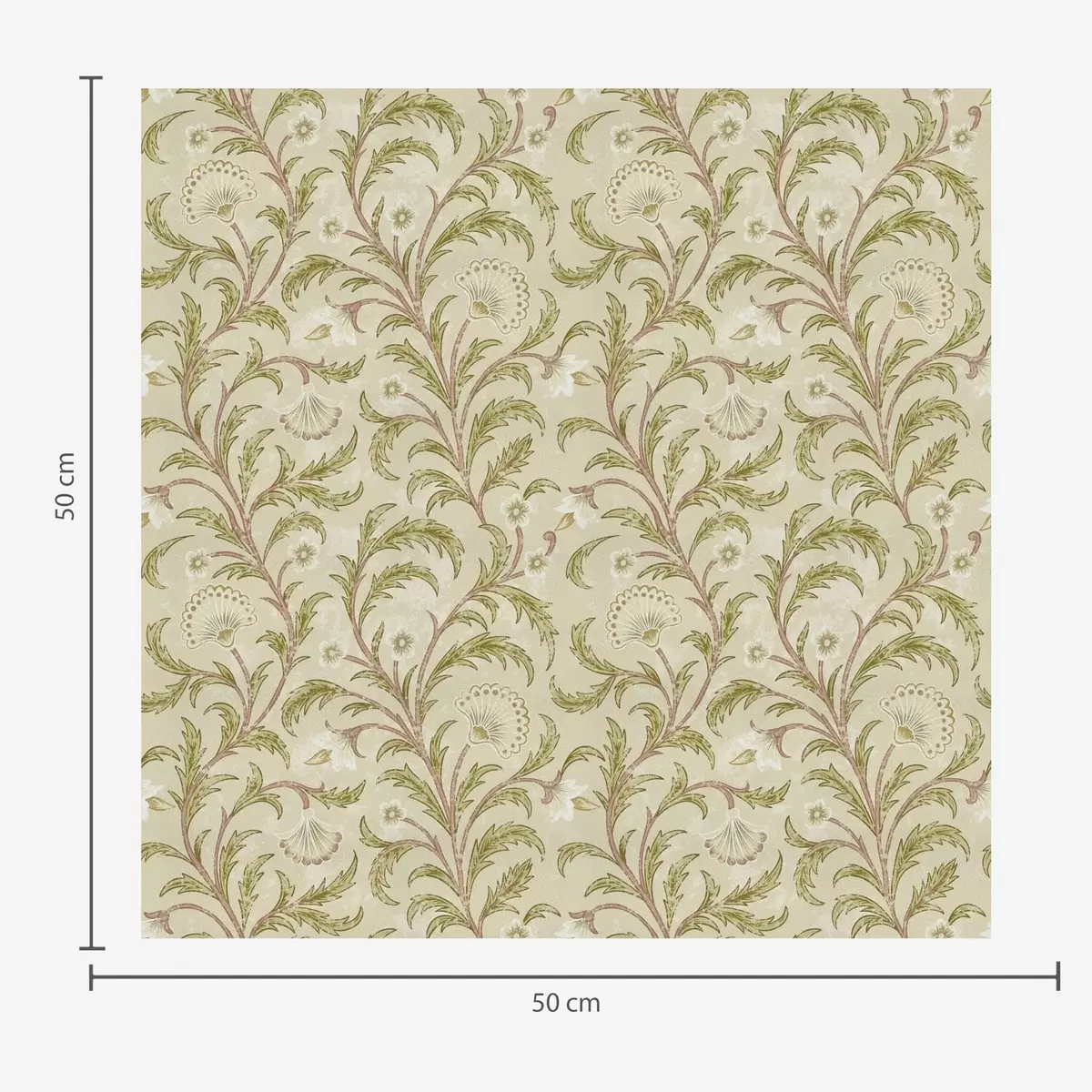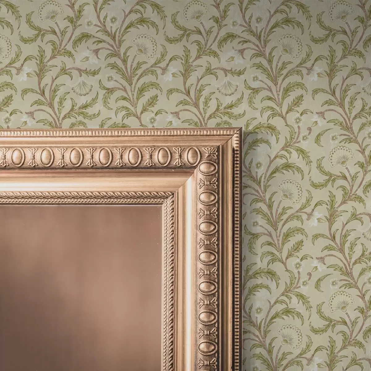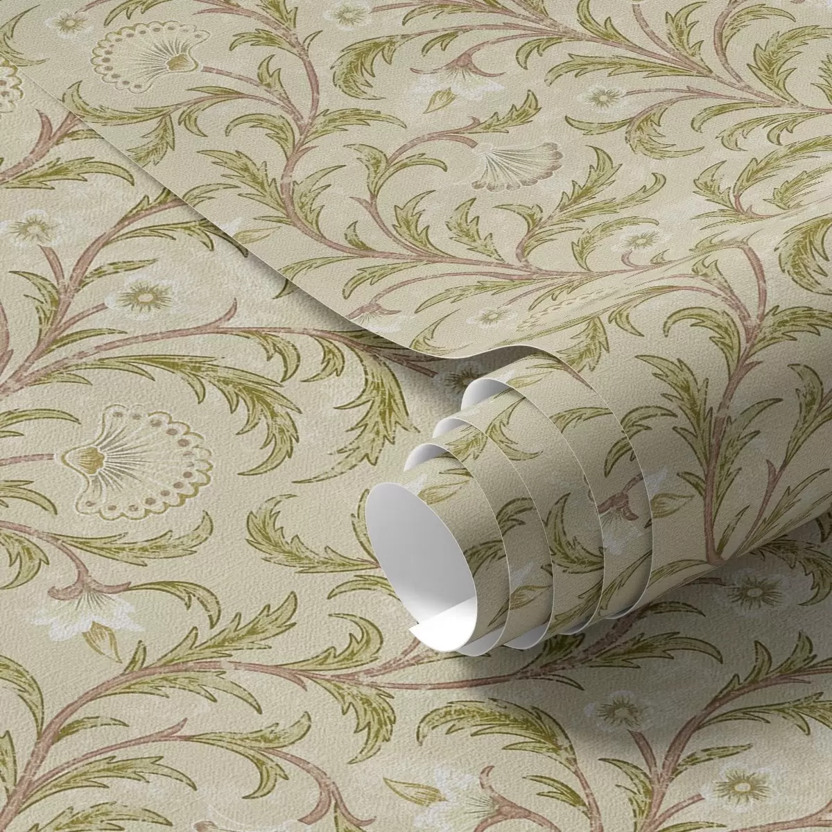 Behang Vintage ornament met krullen en bloemen, beige en olijfgroen Nr. a00574