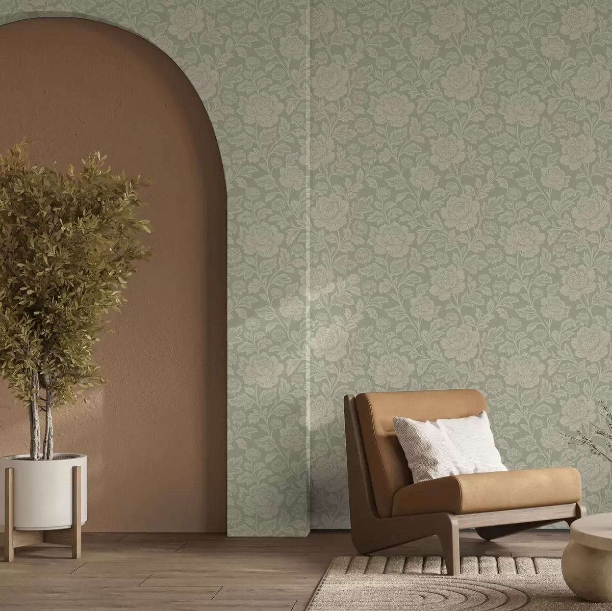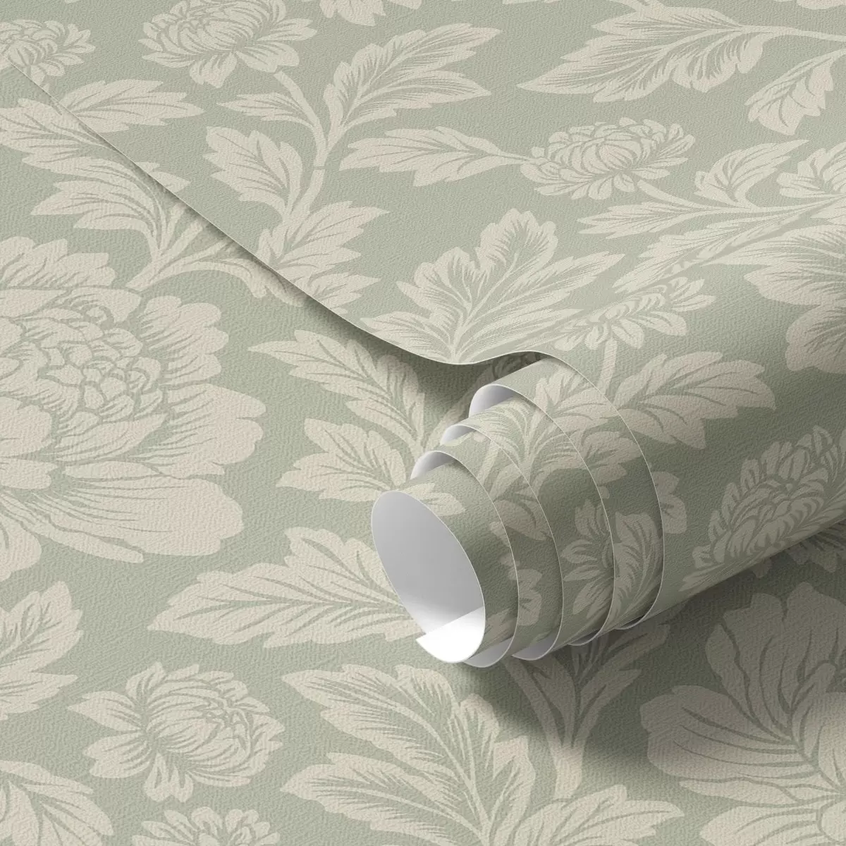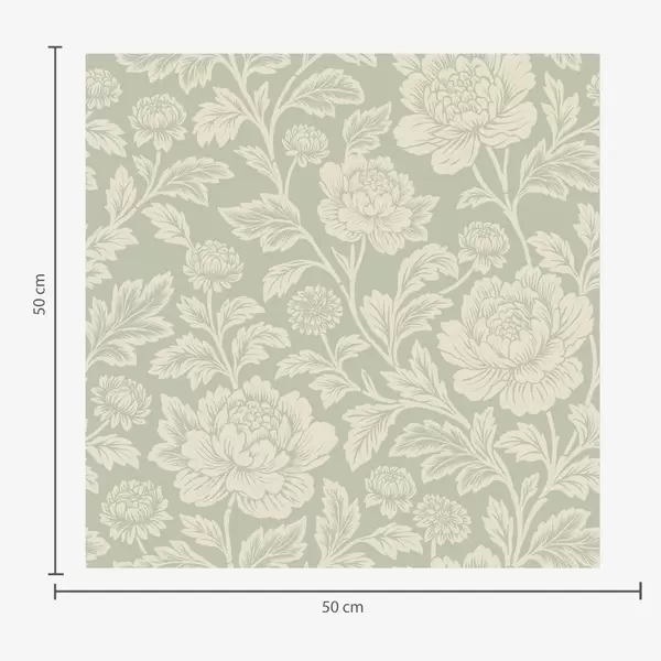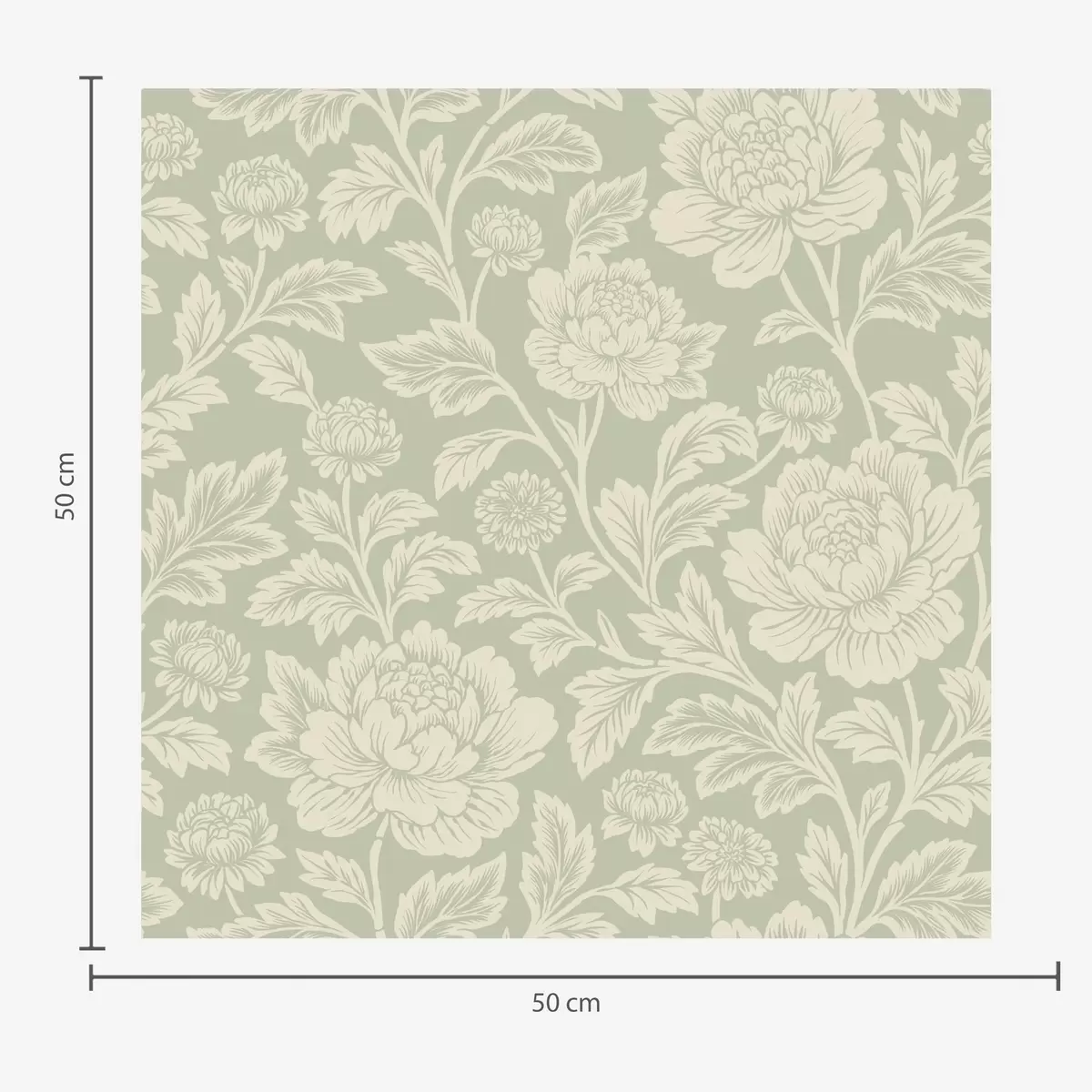 Behang Grote lijntekeningen van pioenrozen op een saliegroene achtergrond Nr. a00582
