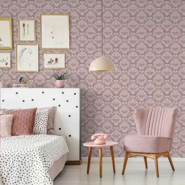 Behang Roze damast: pioenrozen, sneeuwklokjes en kanten trossen a00603