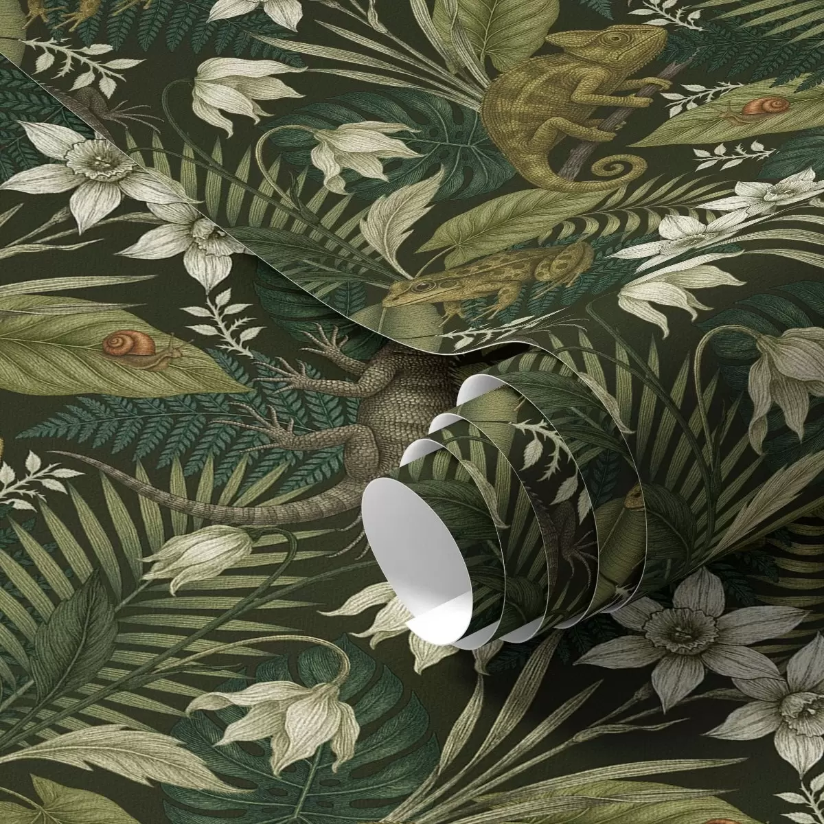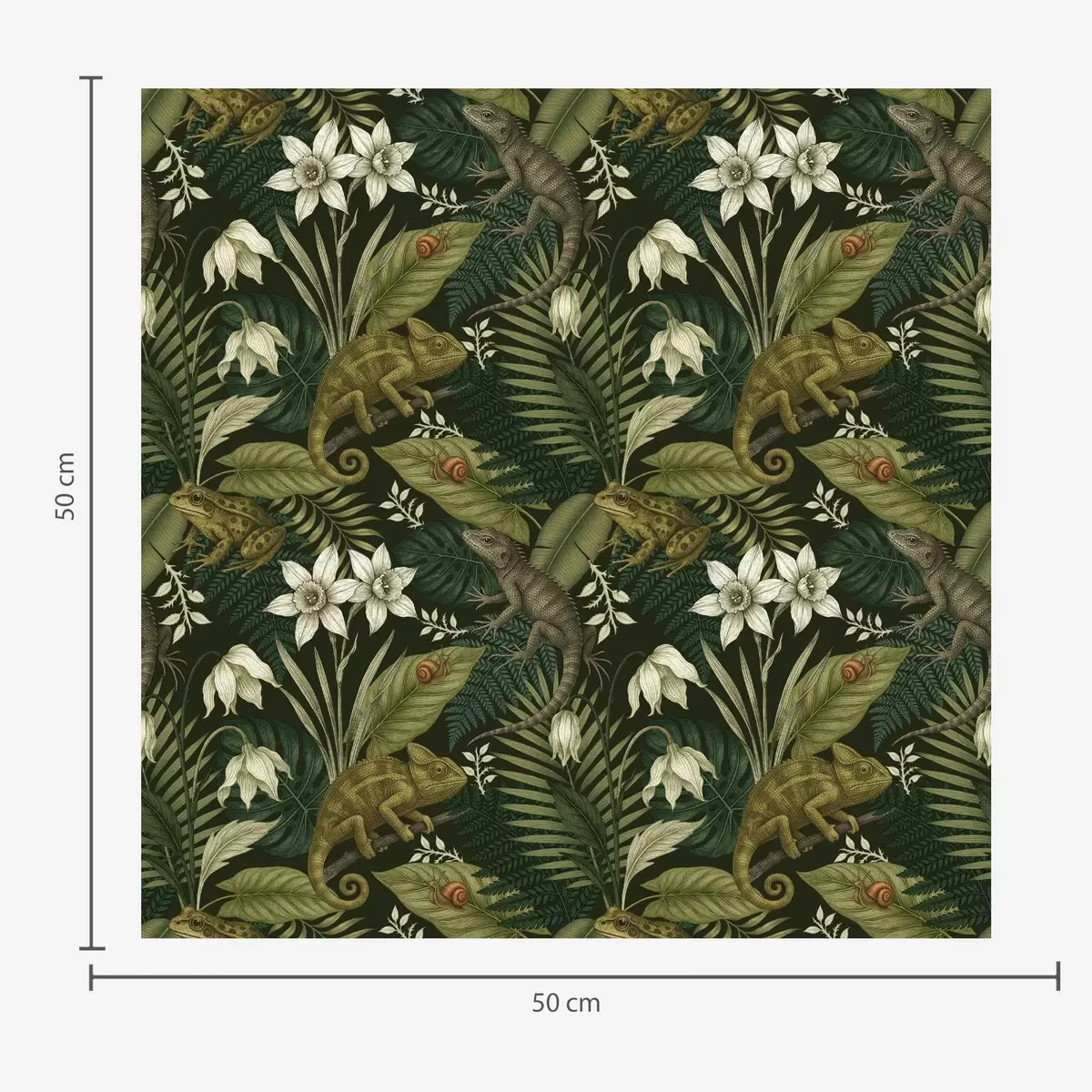 Behang Kameleons en tropische bladeren, witte bloemen, donkere achtergrond Nr. a00608v1