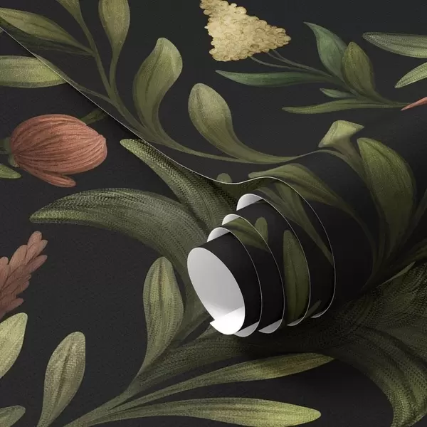 Behang Hoog gras en bloemen op zwarte, gedetailleerde print a00620