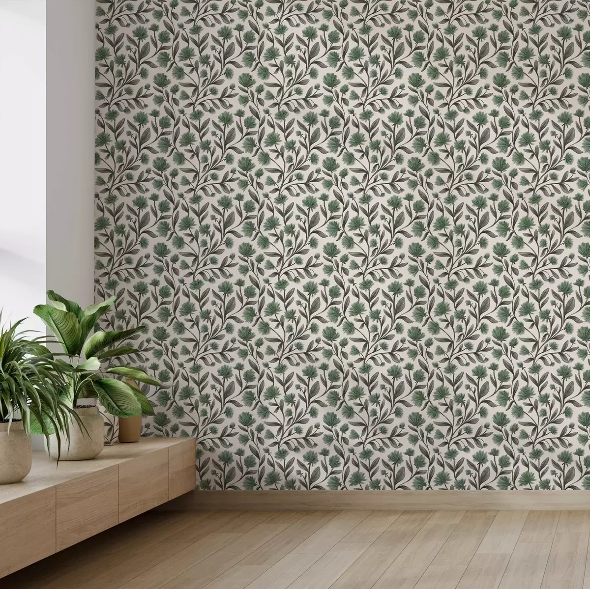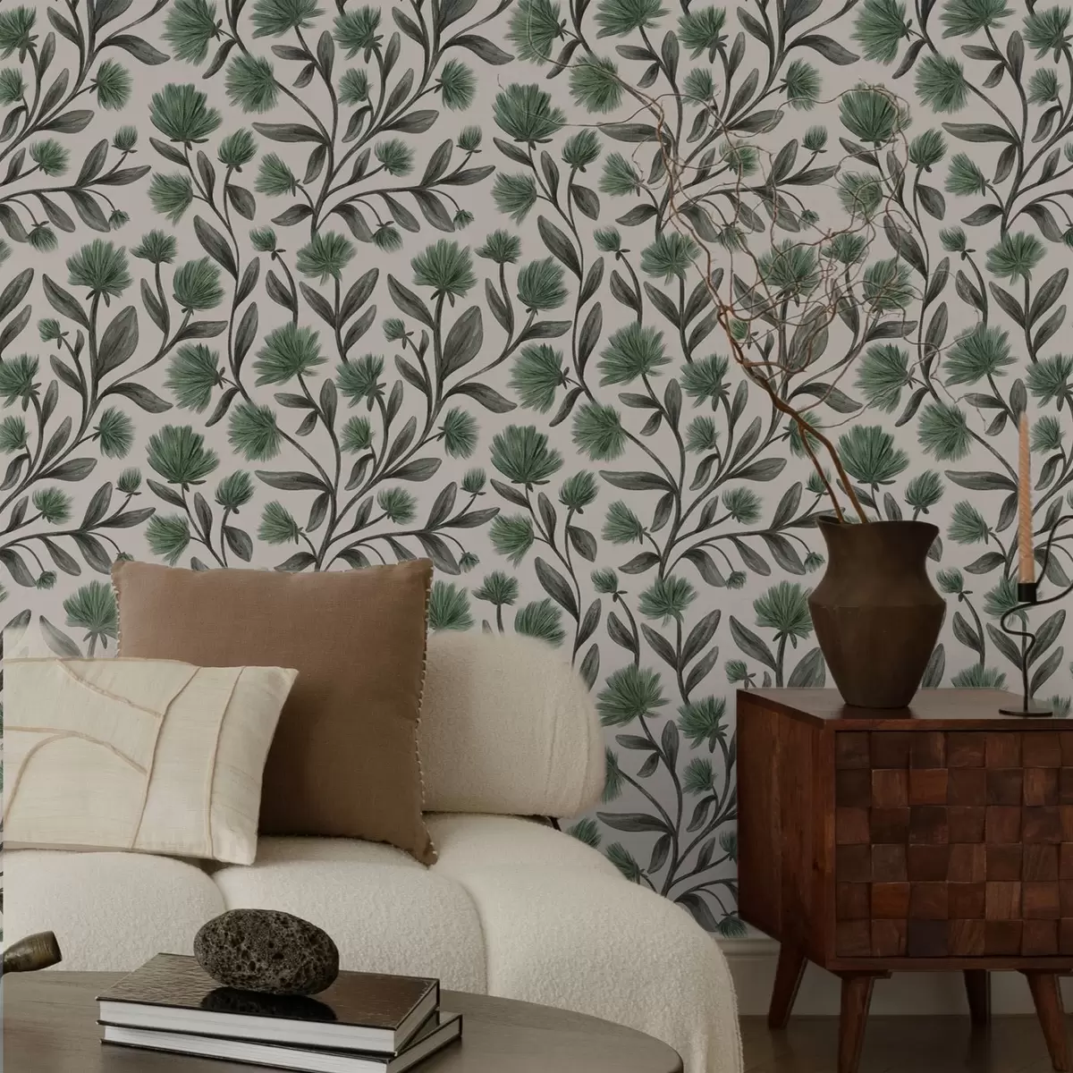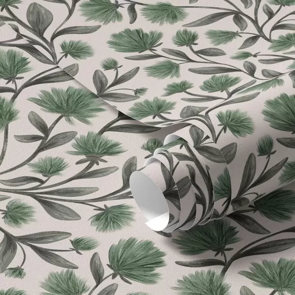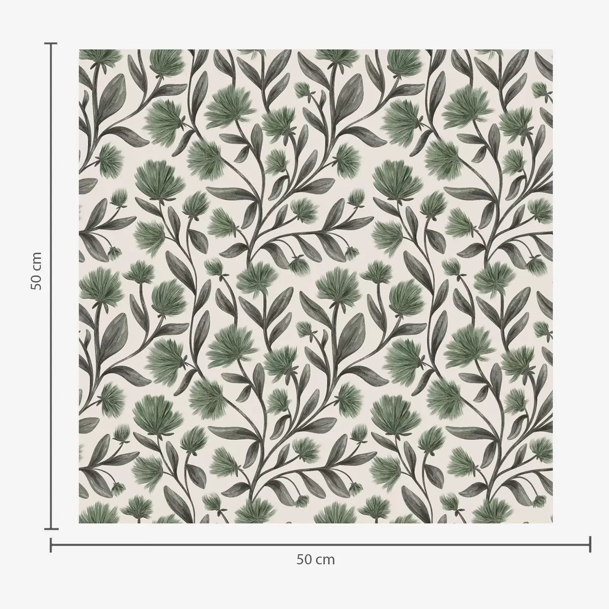 Behang Wilde bloemen in een groen palet op een crèmekleurige achtergrond Nr. a00623v3