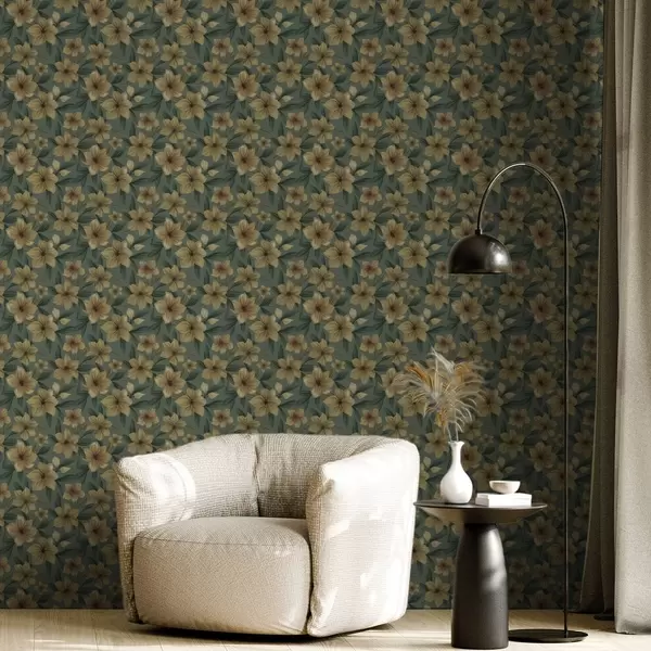 Behang Okerkleurige bloemen op een diepgroene achtergrond, dicht patroon Nr. a00628
