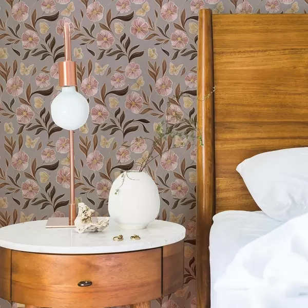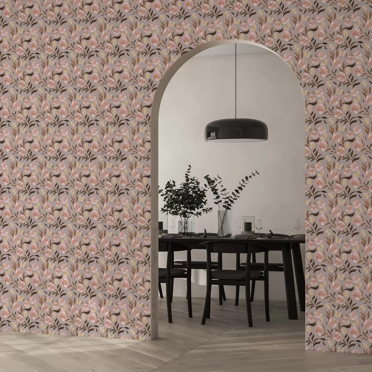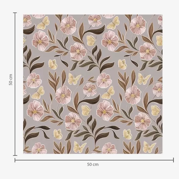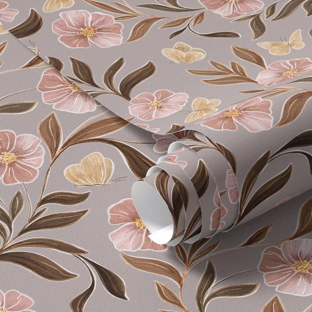 Behang Roze bloemen en vlinders op een grijs-beige achtergrond Nr. a00633