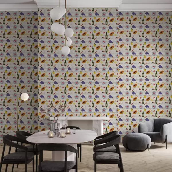 Behang Keukenprint met fruit, glazen en borden Nr. a00638