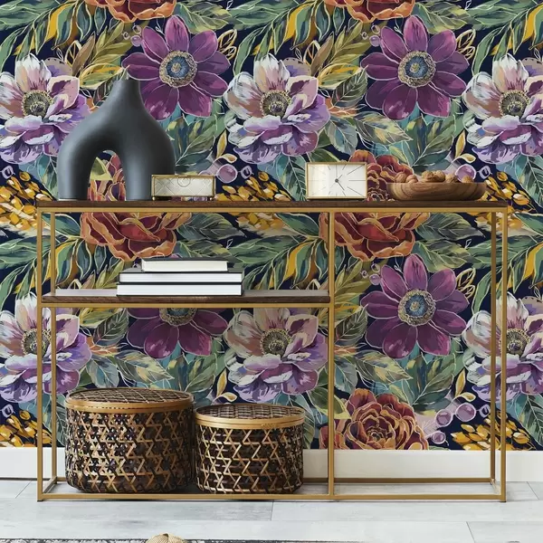 Behang Opvallende, grote, met penseel geschilderde bloemen op een donkerblauwe achtergrond Nr. a00643