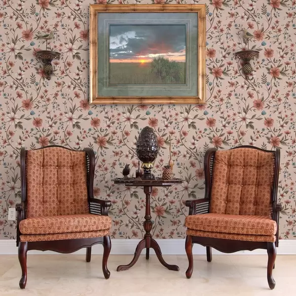 Behang Roze-koraalkleurige bloemen en bladeren op oudroze Nr. a00667