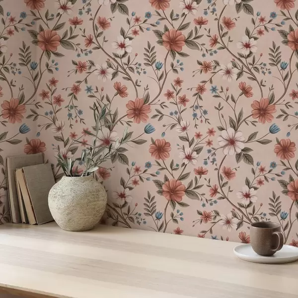 Behang Roze-koraalkleurige bloemen en bladeren op oudroze Nr. a00667