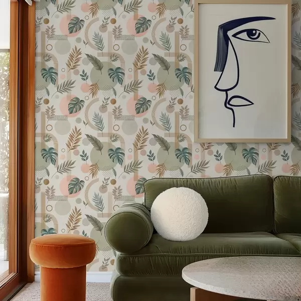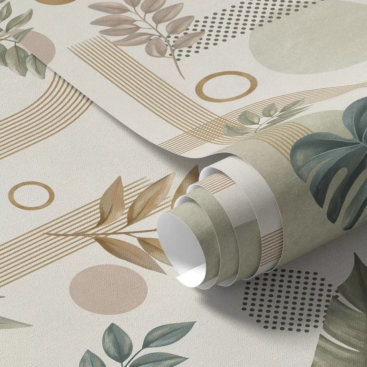 Behang Bladeren en geometrische vormen in rustige, warme tinten Nr. a00677
