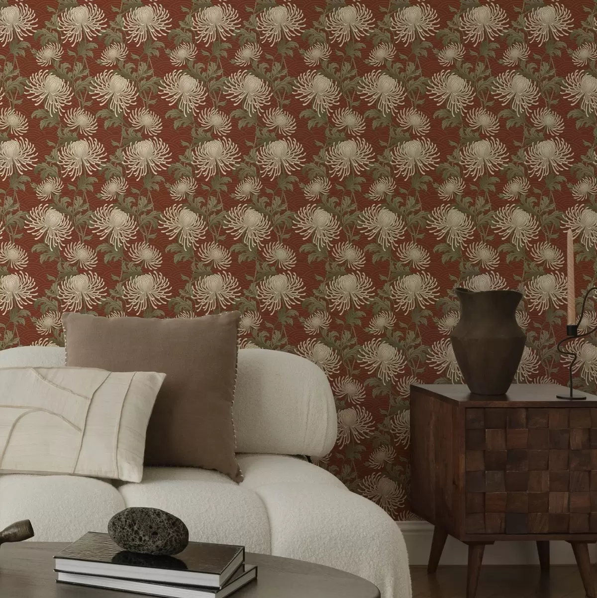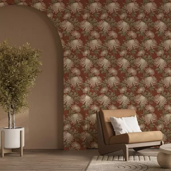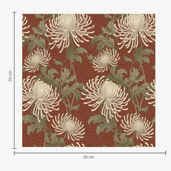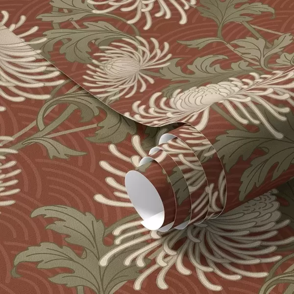 Behang Crèmekleurige chrysanten op een terracotta achtergrond, Aziatische stijl Nr. a00693