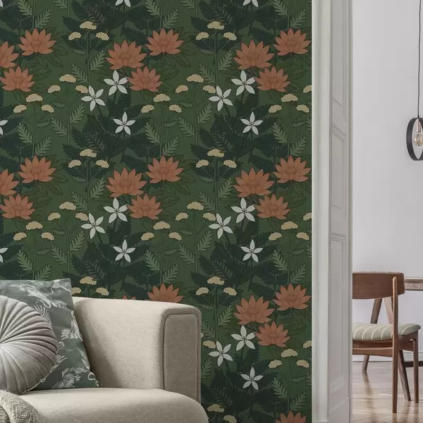 Behang Grote bloemen tussen groen blad, decoratieve compositie Nr. a00708