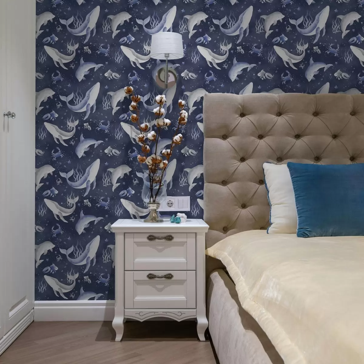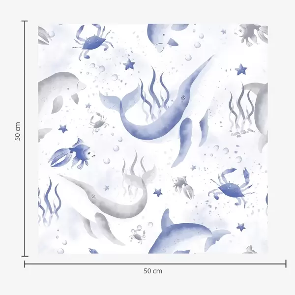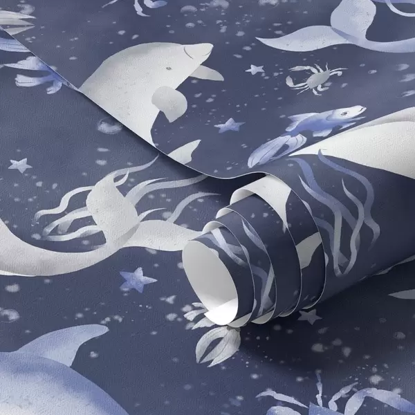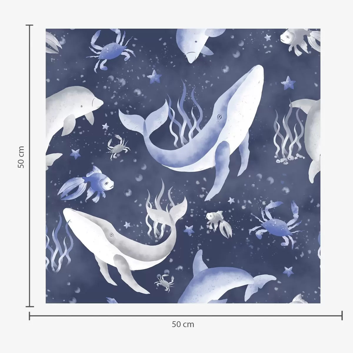 Behang Zeewalvissen, dolfijnen en krabben op een donkerblauwe achtergrond Nr. a00720