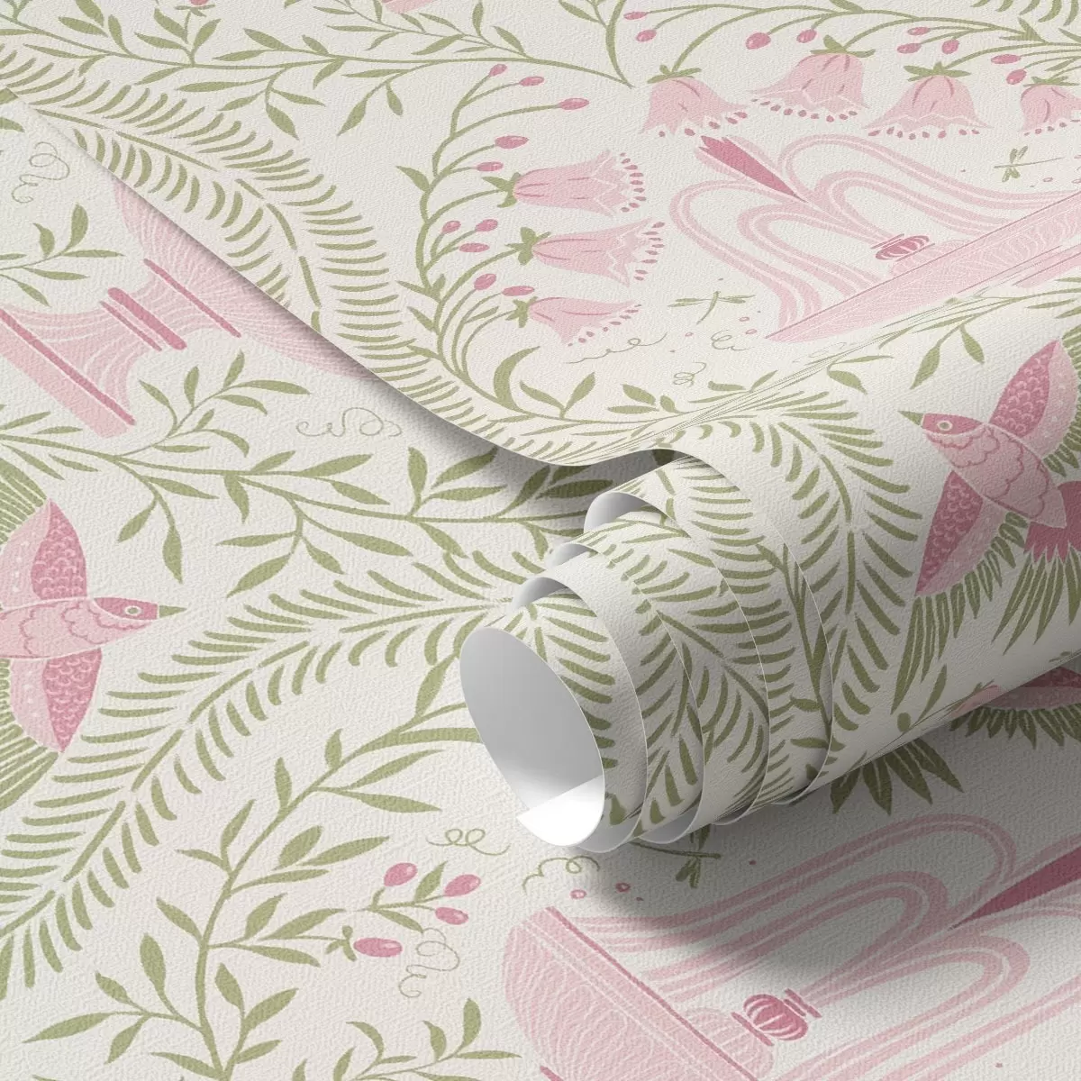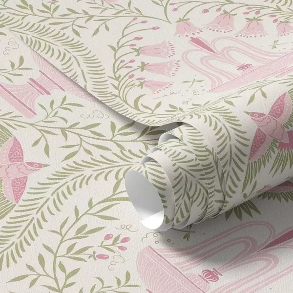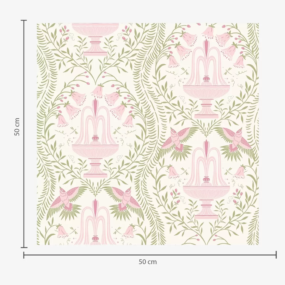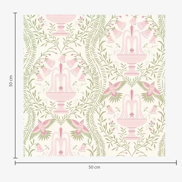 Behang Fonteinen, kolibries en groene krullen op een lichte achtergrond Nr. a00723