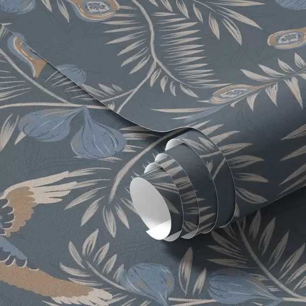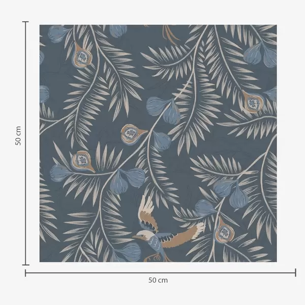 Behang Vogel tussen blauwe vruchten en palmbladeren, indigo Nr. a00726