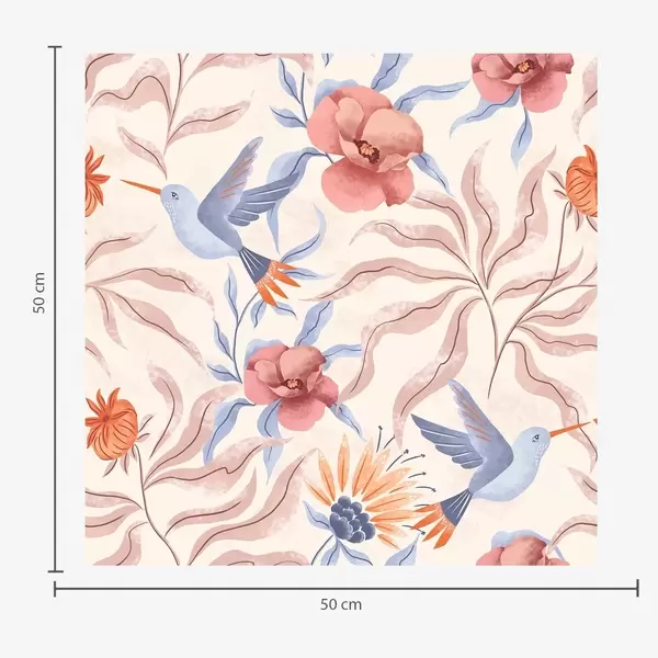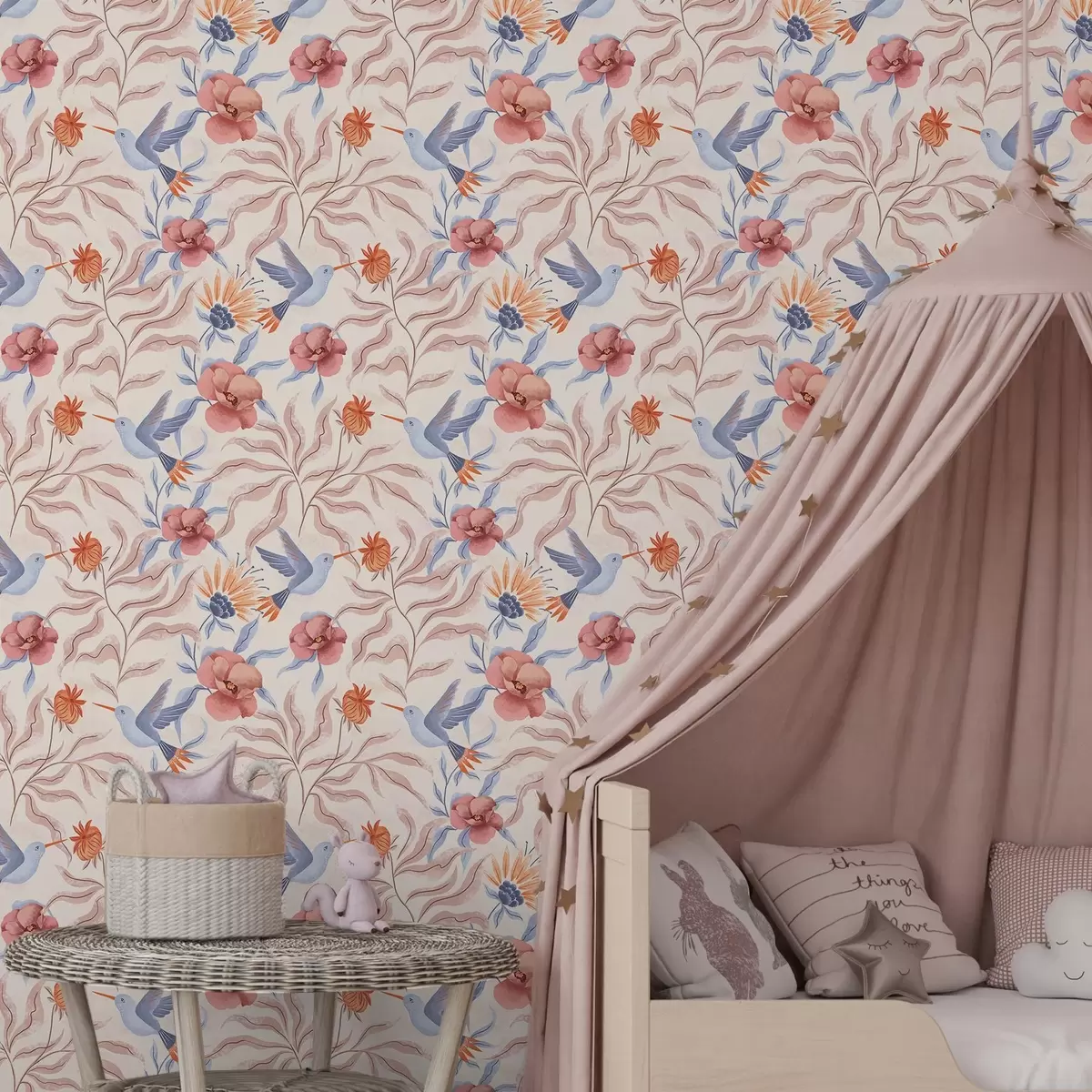 Behang Kolibries tussen grote bloemen in roze en blauwe tinten Nr. a00733