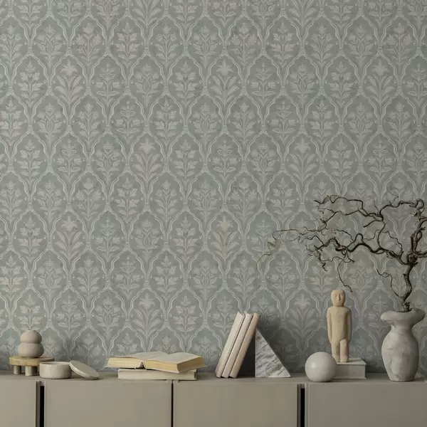 Behang Mint damast met fijne bloemenmedaillons a00741