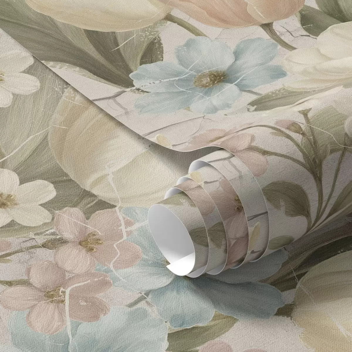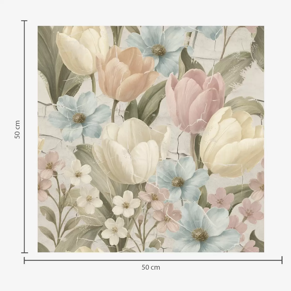 Behang Pastelkleurige tulpen en bloemen op een licht gebarsten achtergrond Nr. a00756
