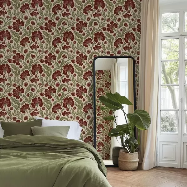 Behang Bordeauxrode bloemen met groene bladeren op een lichte achtergrond Nr. a00761