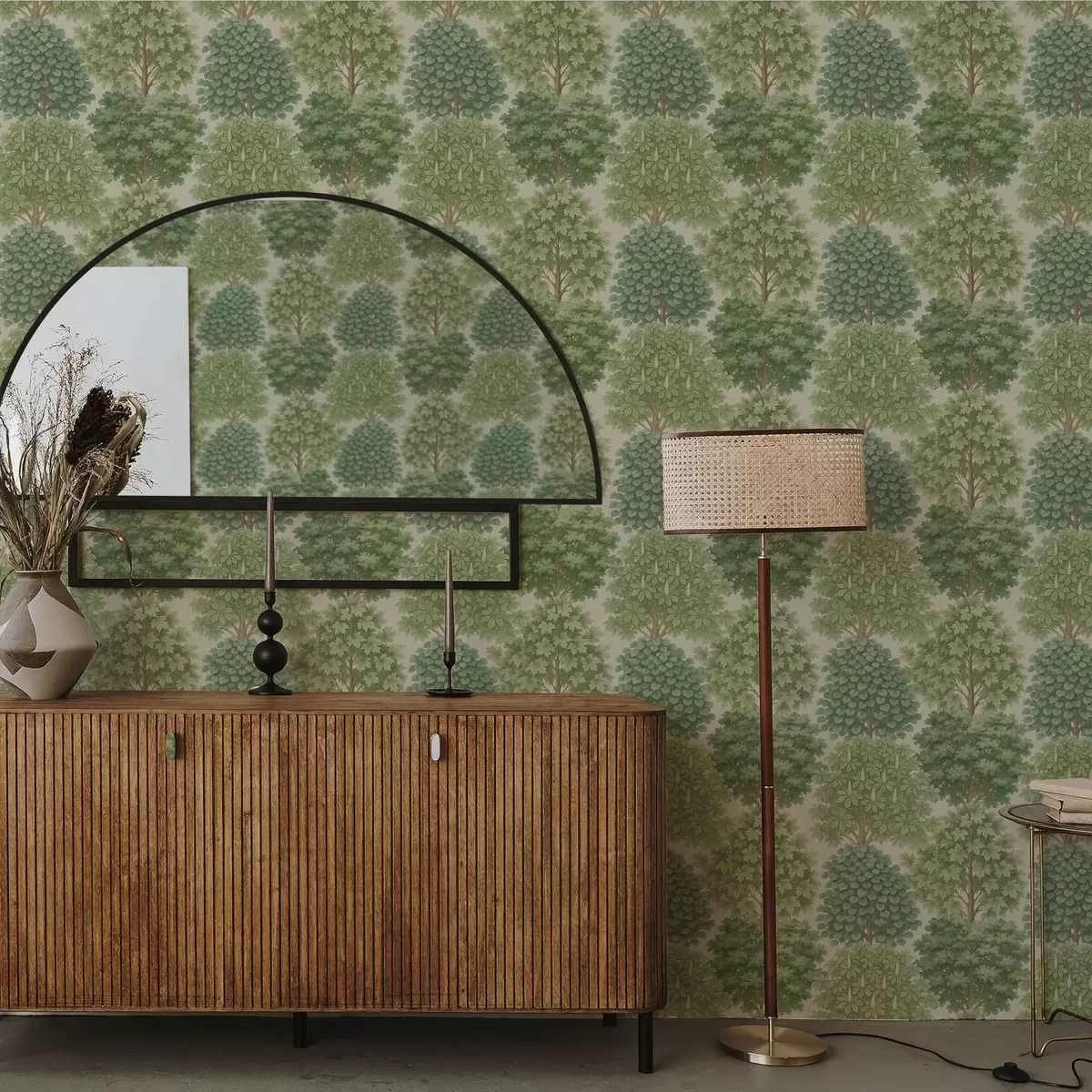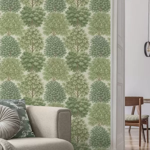 Behang Boomgaard in zachte groentinten op een lichte ondergrond Nr. a00775