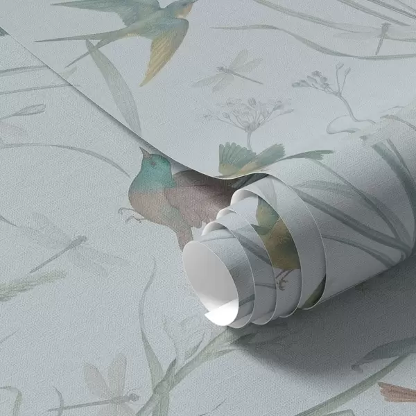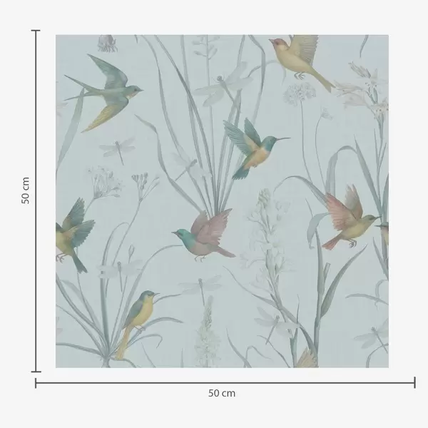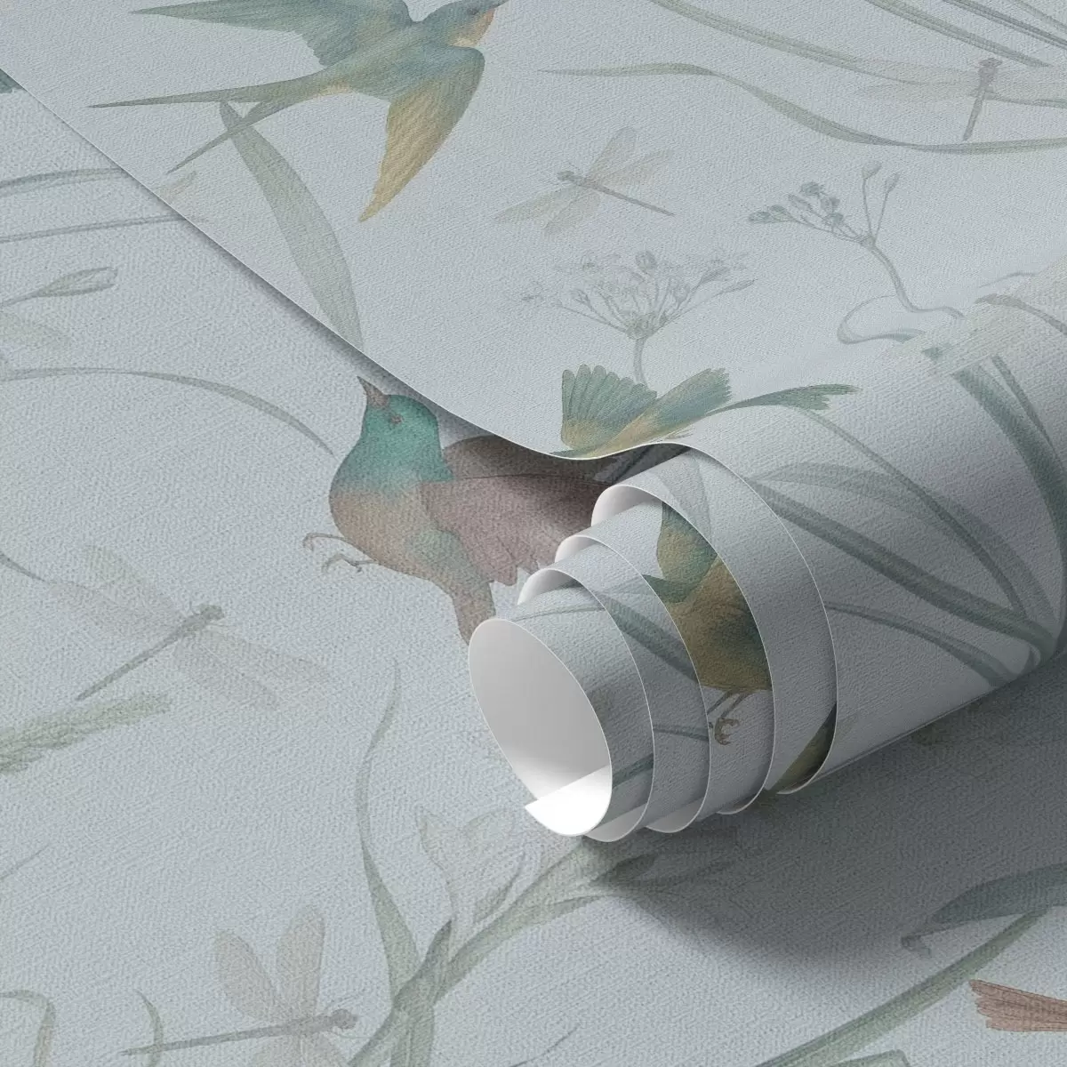 Behang Vogels tussen weidegrassen op grijsblauwe grond Nr. a00776