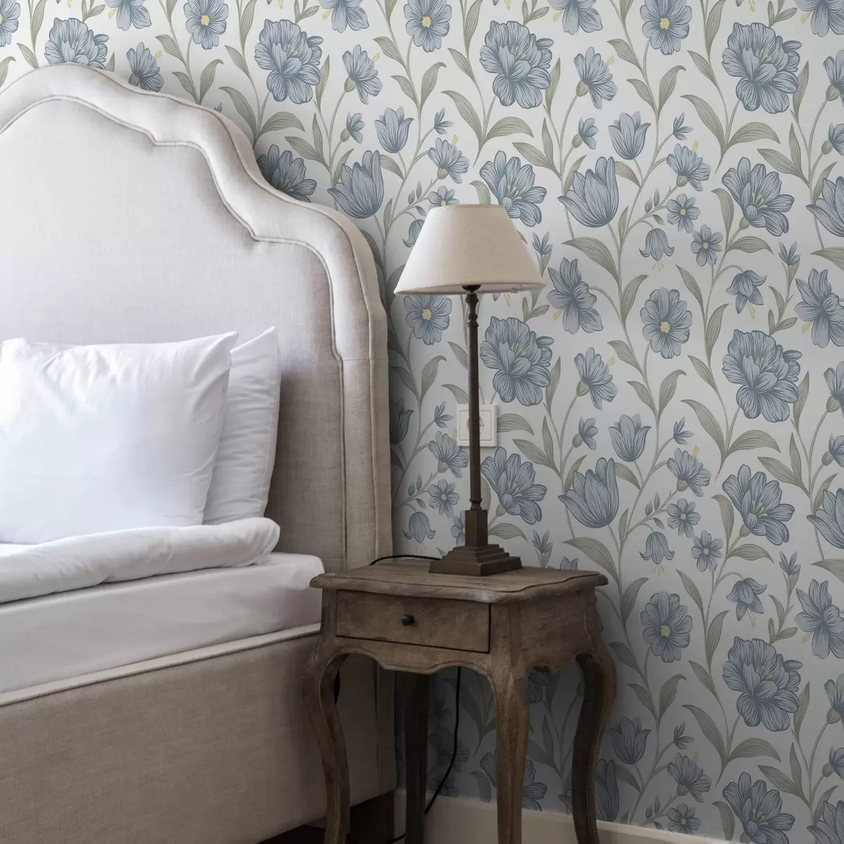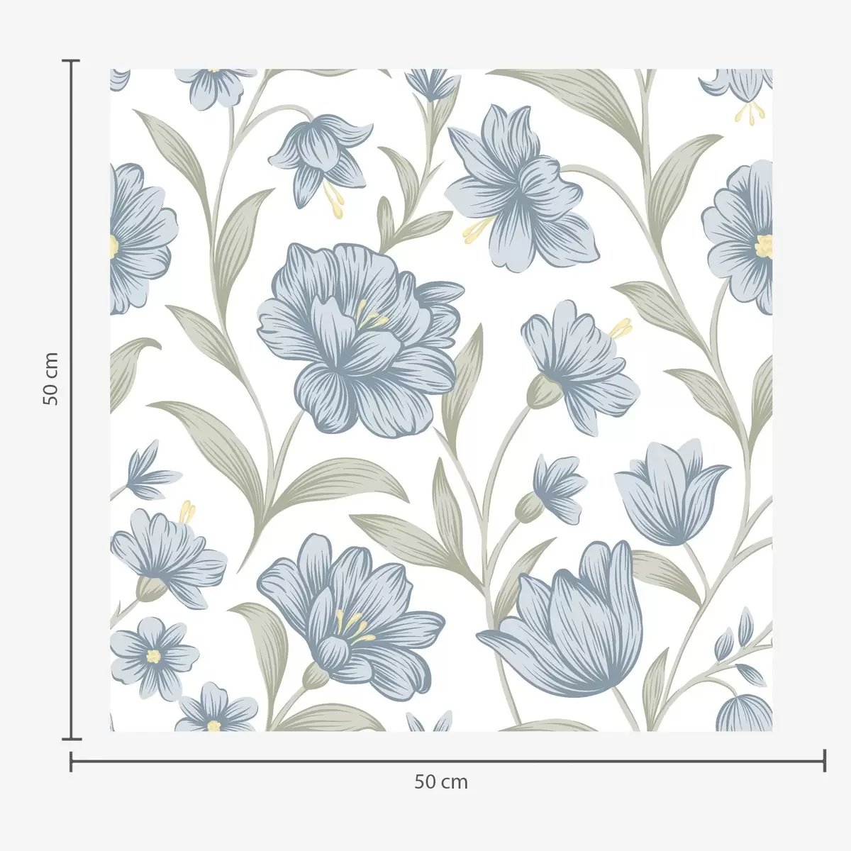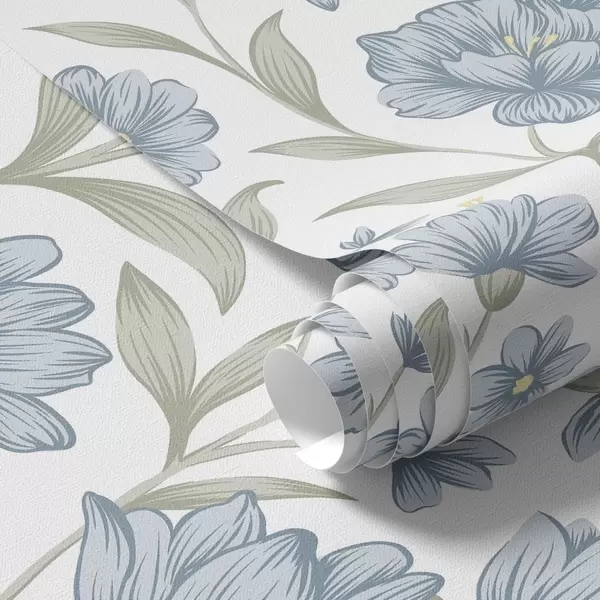 Behang Stoffige blauwe bloemen met olijfbladeren op wit Nr. a00780