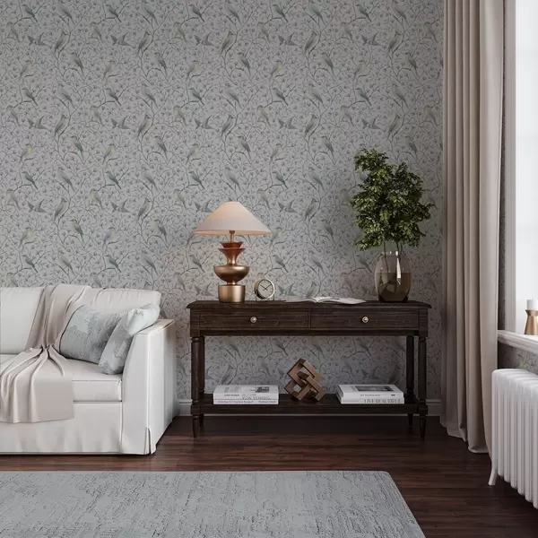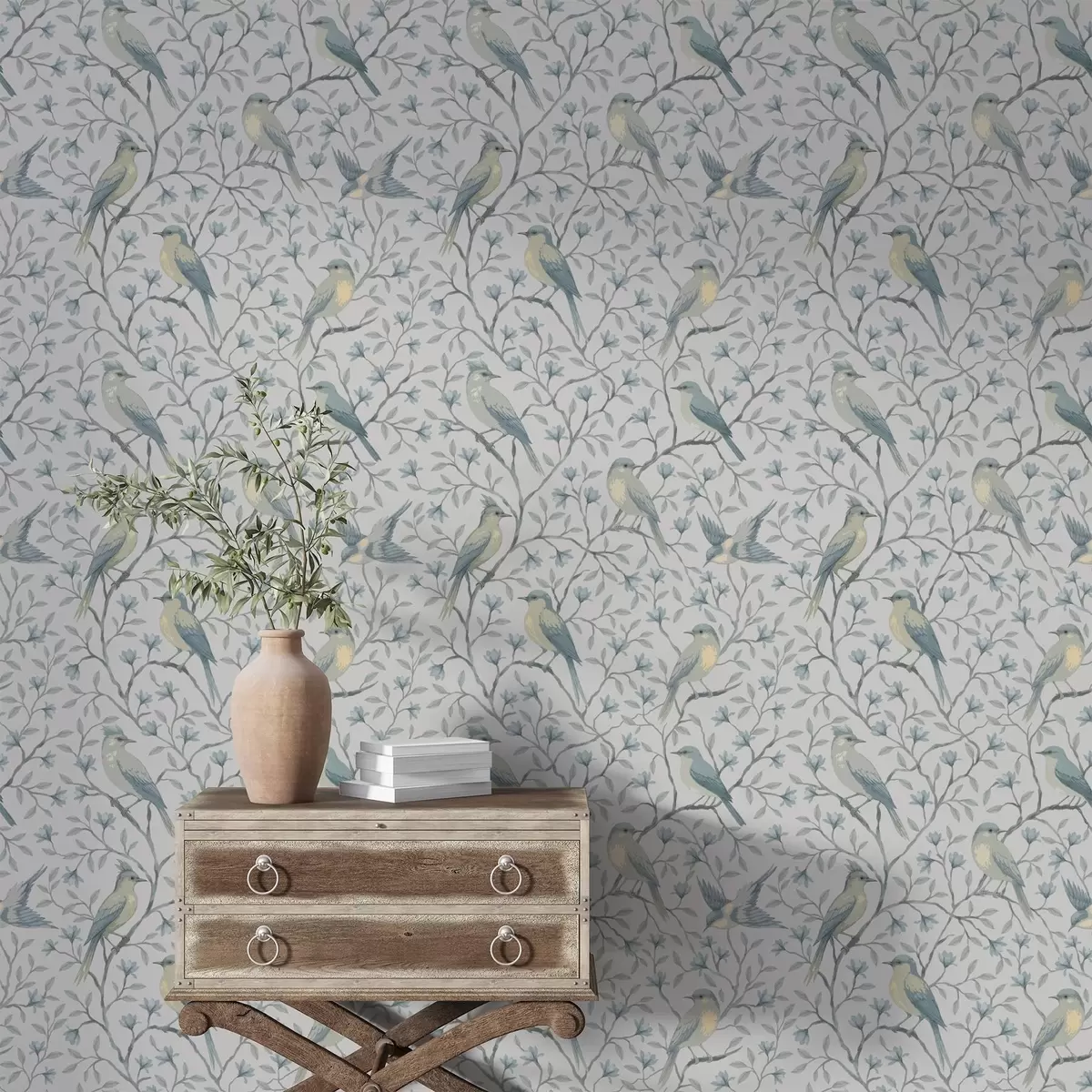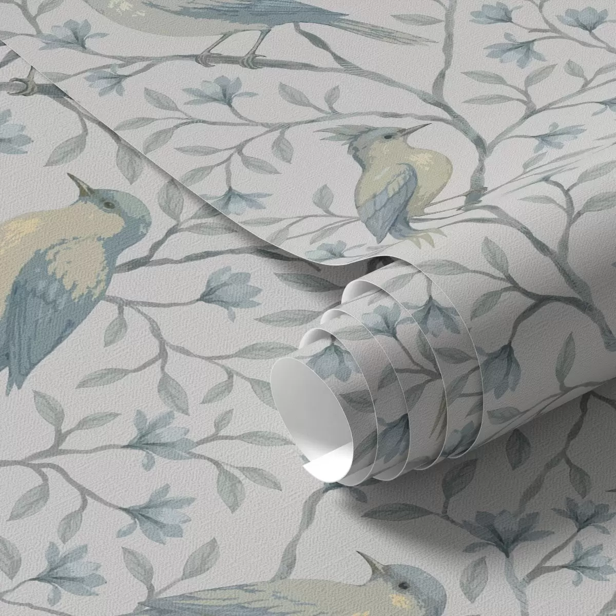 Behang Vogels op takken, grijsblauw kleurenschema Nr. a00782