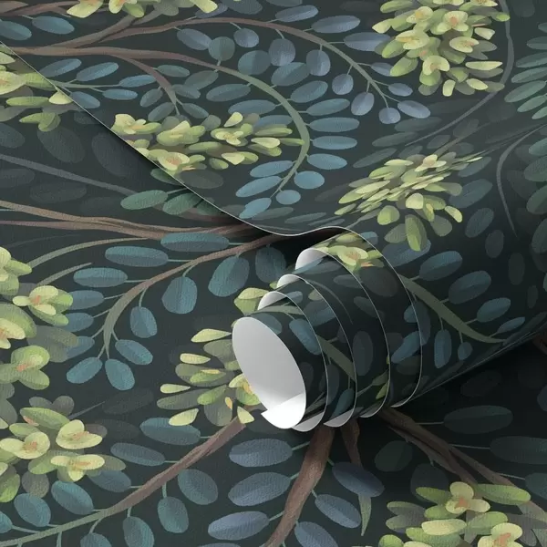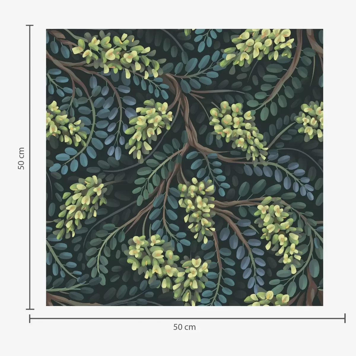 Behang Takken met groenachtige bloeiwijzen op een donkere achtergrond Nr. a00786