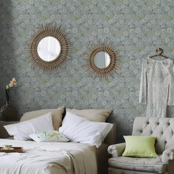 Behang Pluizige paardenbloemen en zaden op een muntgroene achtergrond Nr. a00790