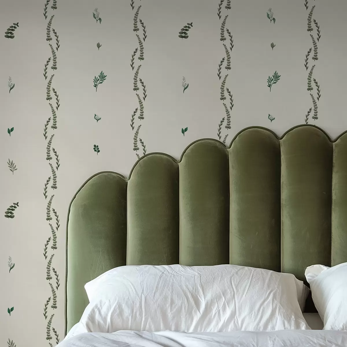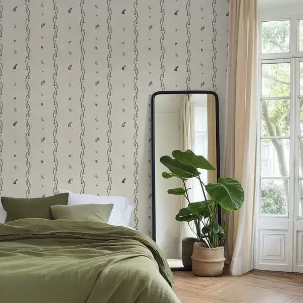 Behang Schaars groene scheuten in een verticaal ritme, crèmekleurige achtergrond Nr. a00818