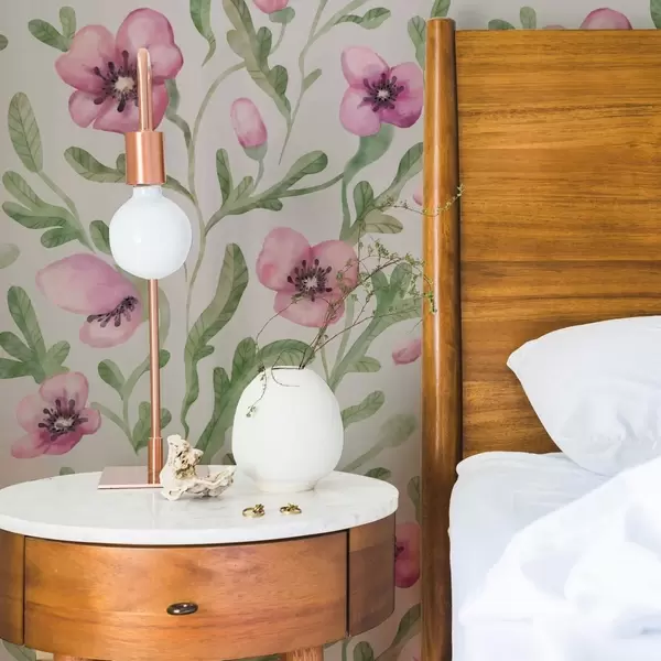 Behang Delicate roze klaprozen met bladeren in aquareltechniek Nr. a00830