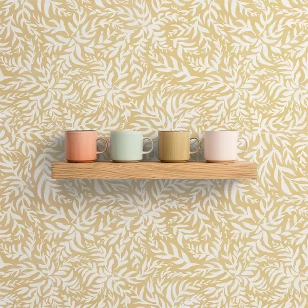 Behang Wit bladpatroon op warm oker, wervelend ritme Nr. a00845