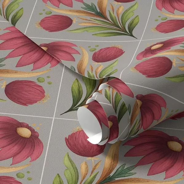Behang Symmetrisch bloemenornament op grijze achtergrond met diagonalen Nr. a00869