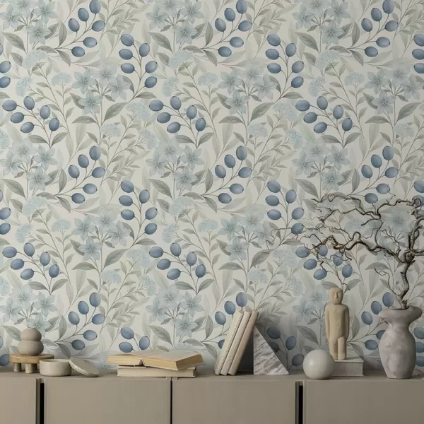 Behang Blauwe bessen en lichte bloemen op ivoor Nr. a00872