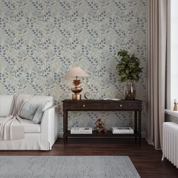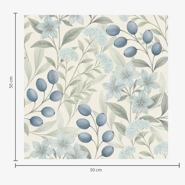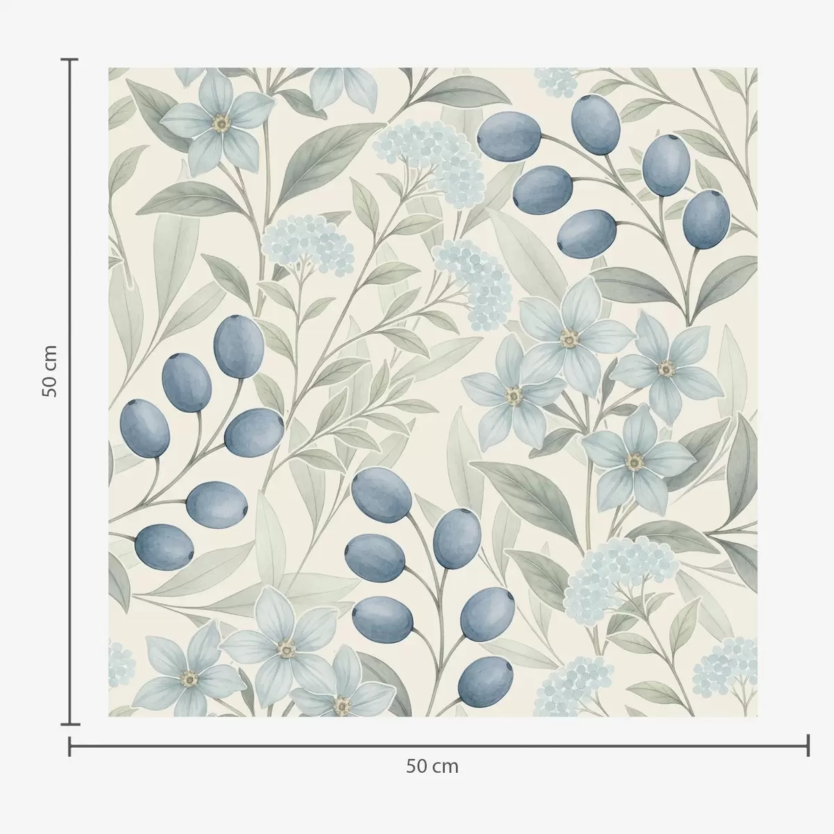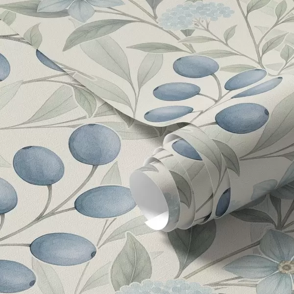 Behang Blauwe bessen en lichte bloemen op ivoor Nr. a00872