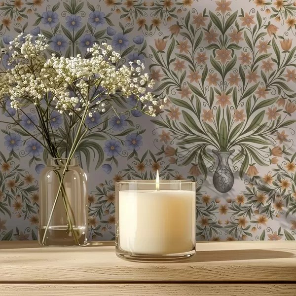 Behang Afwisselende vazen en blauwe bloemen in salie op blush Nr. a00901