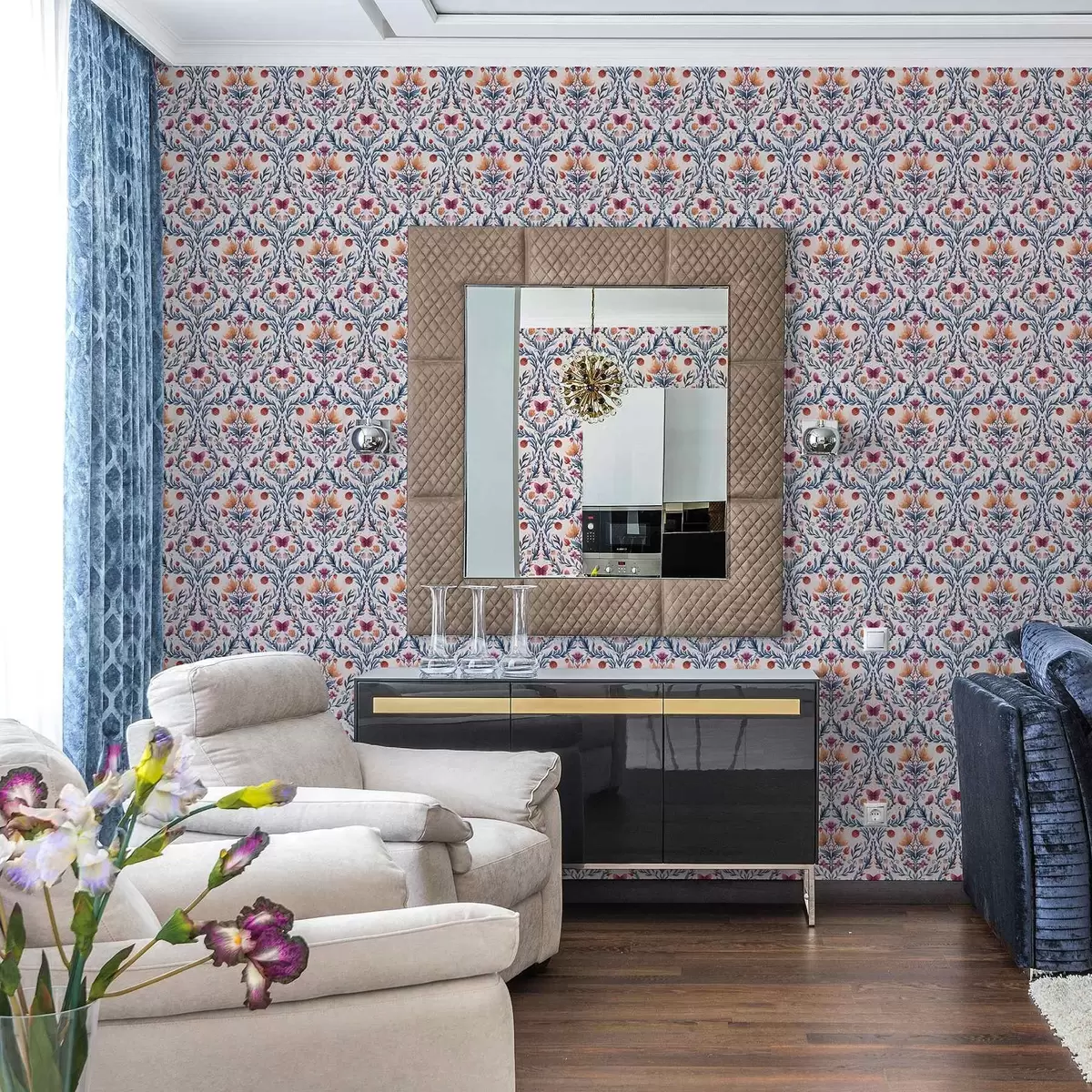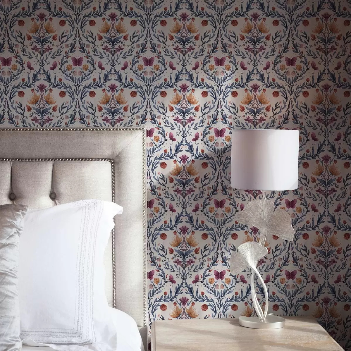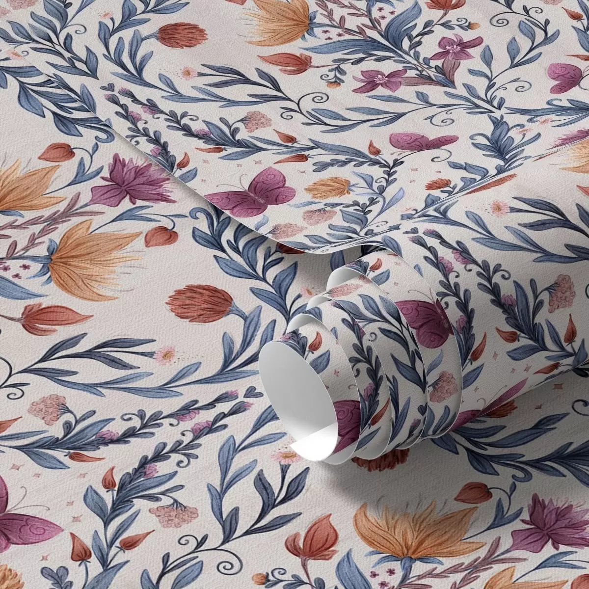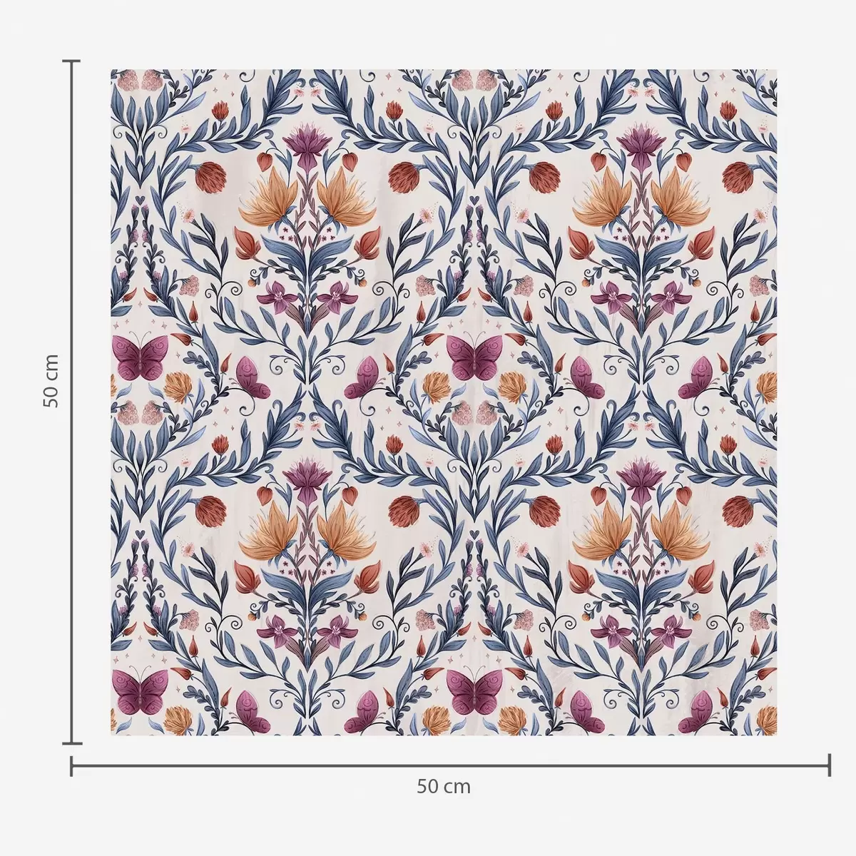 Behang Bloemendamast met vlinders in marineblauw en terracotta op wit Nr. a00926v1