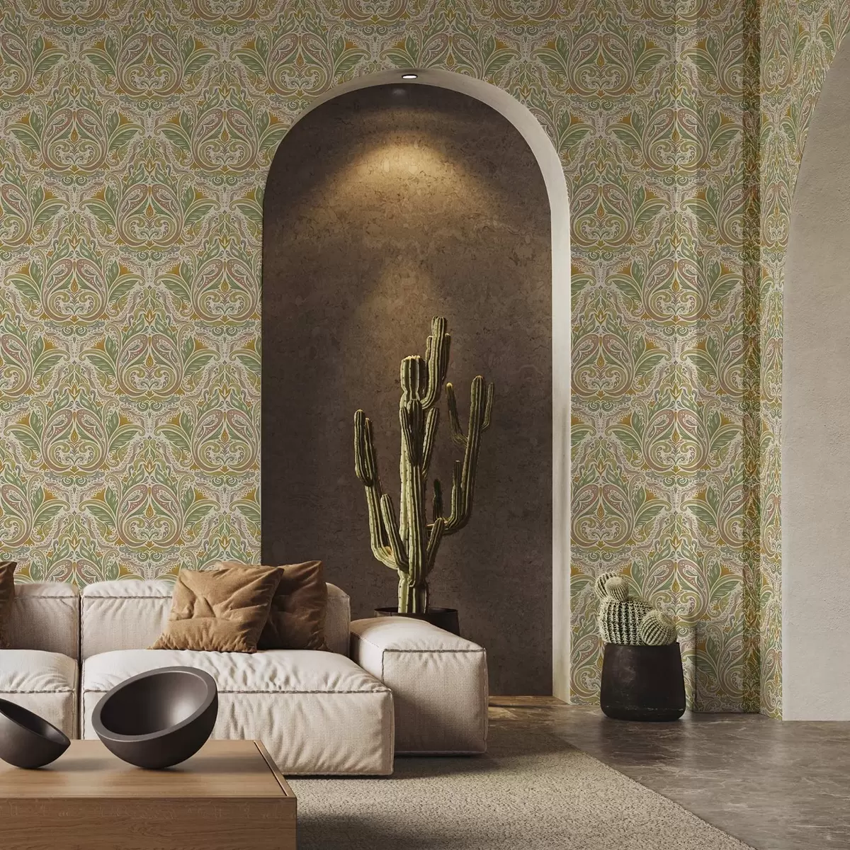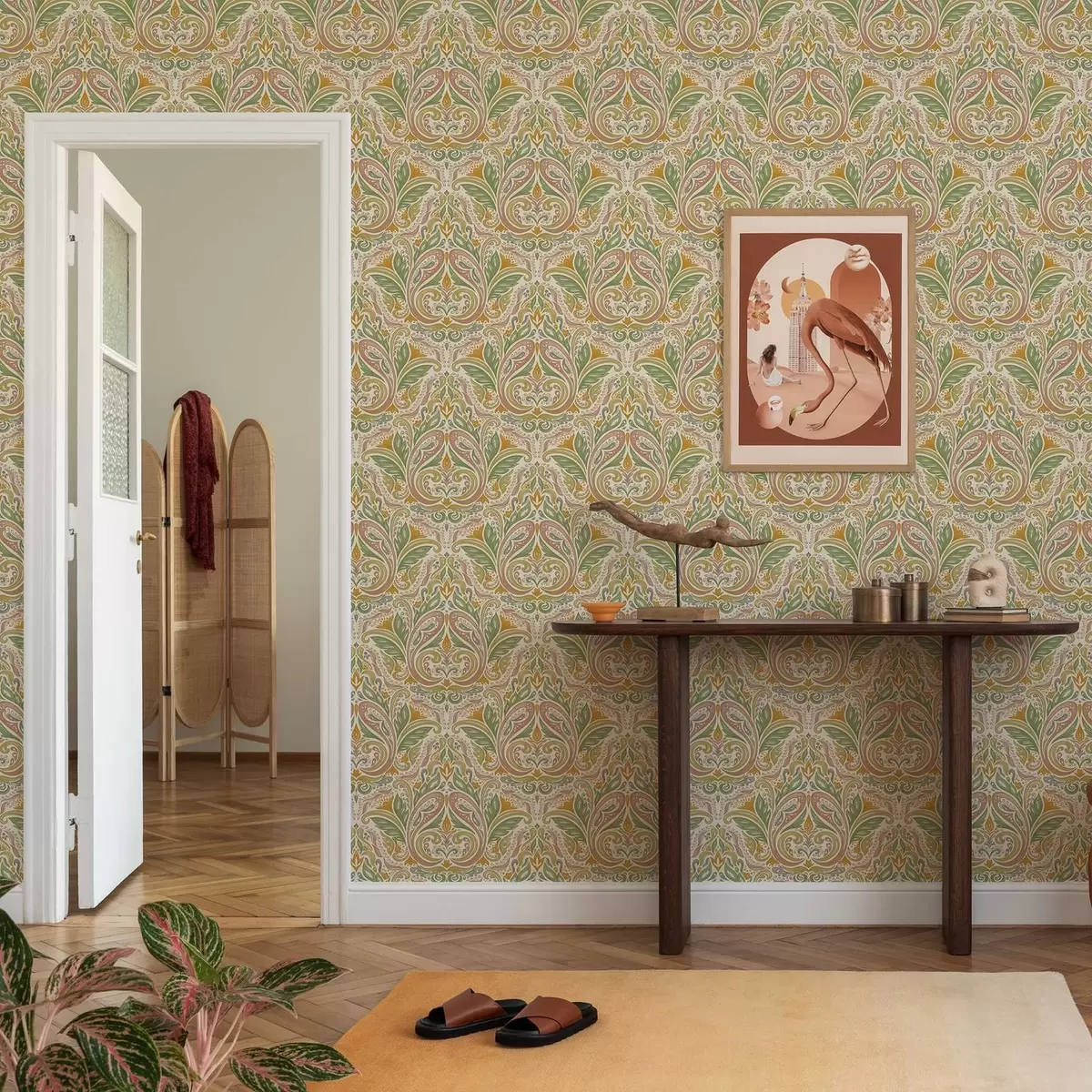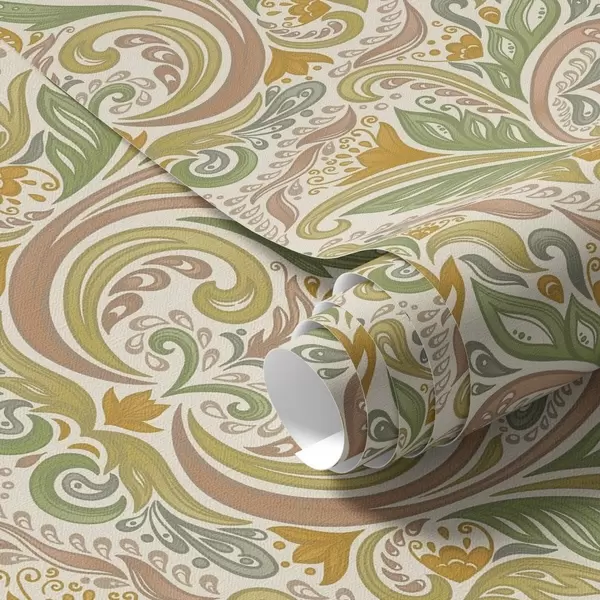 Behang Sierlijke bladerenkrullen in groene en terracottatinten Nr. a00927v1